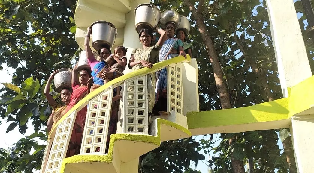 Gollapeta Tribal Women Climb Water Tank With Empty Pots