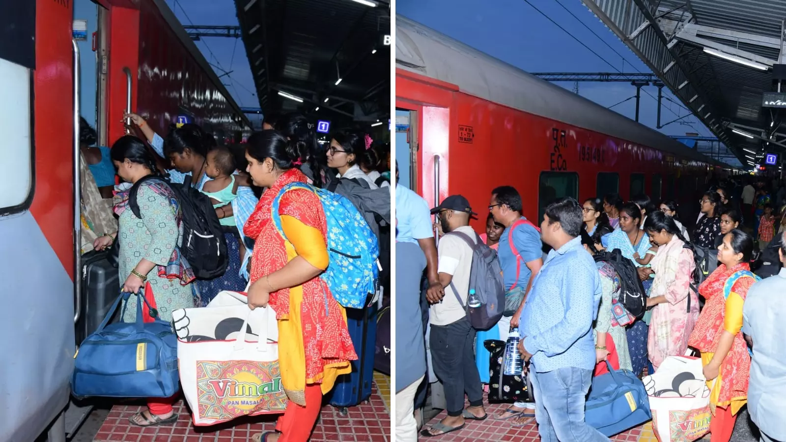 Railway station platforms, including key junctions such as Vijayawada, Tirupati, and Guntakal, are packed. Passengers are struggling to board trains. Crowds can be seen at waiting halls and even on footbridges. In many cases, passengers are forced to squeeze into already crowded compartments, making even short-distance travel uncomfortable.