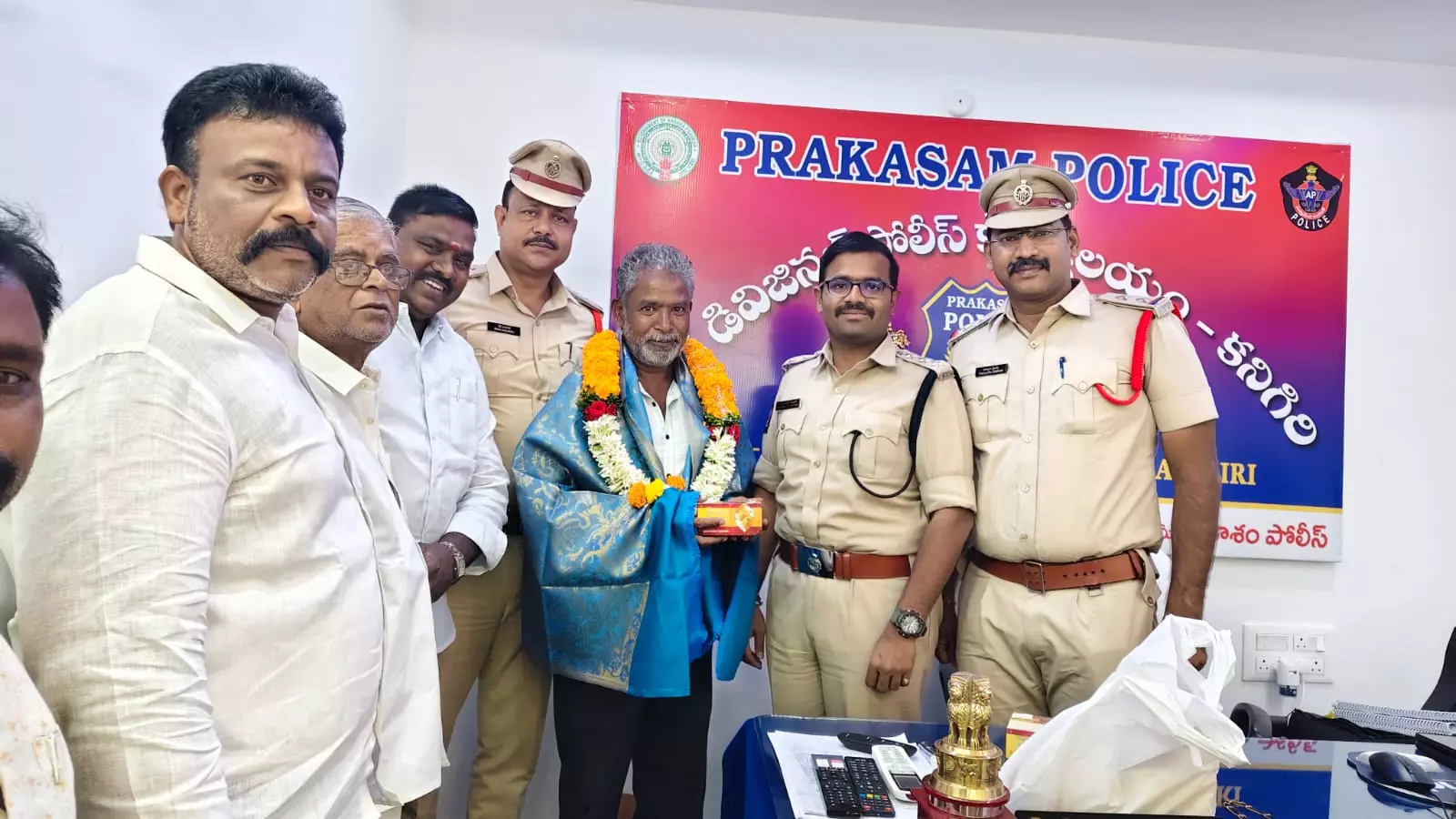 In recognition of his honesty, Kanigiri DSP P. Sai Eshwar Yeshwanth, CI Sheikh Khajavali, and SI T. Sriram felicitated Sheikh Gouse Basha with a shawl at the police station.