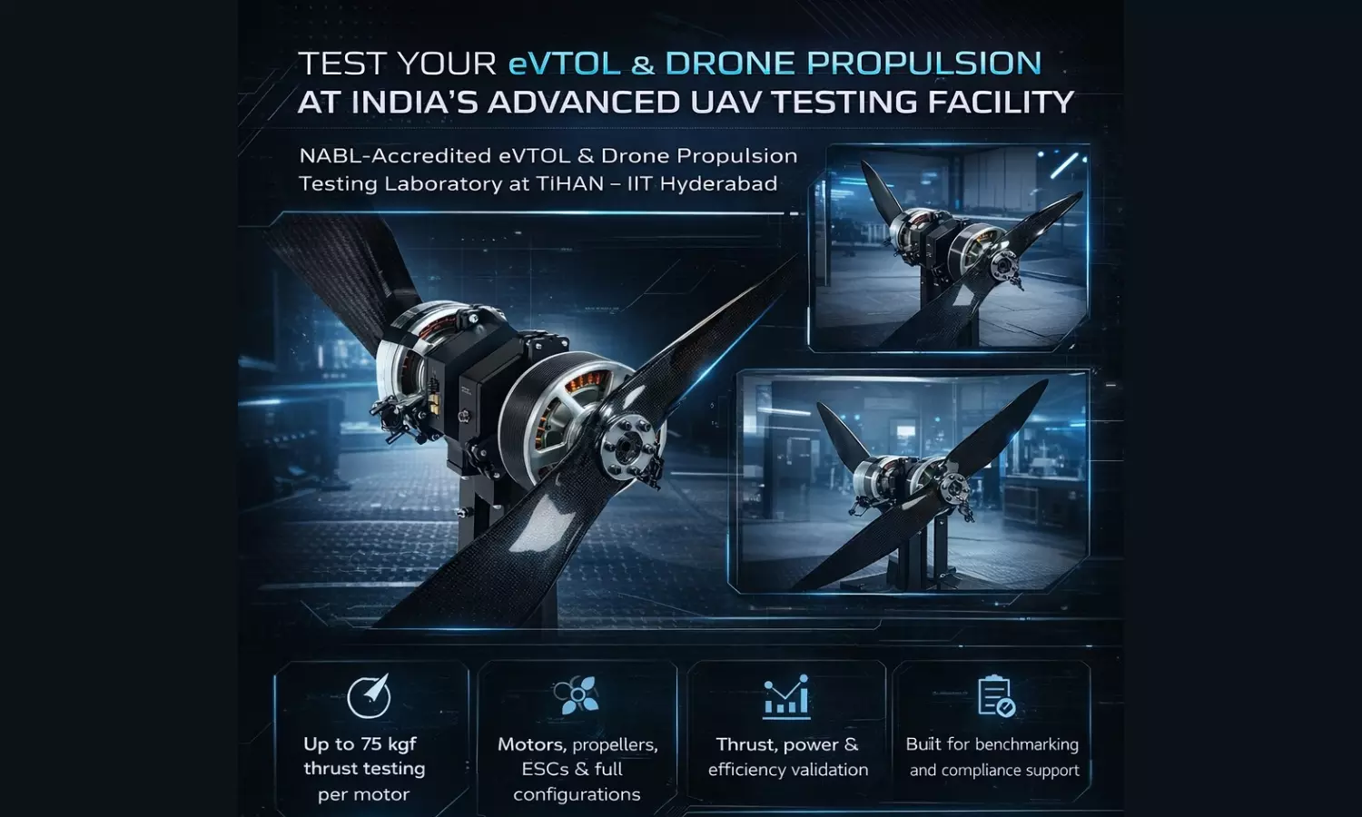 IIT-H’s eVTOL (vertical take-off and landing) and drone propulsion testing laboratory is accredited to the National Accreditation Board for Testing and Calibration Laboratories. The lab is being set up under the IIT-H’s Technology Innovation Hub on Autonomous Navigation (TiHAN) Foundation. The accreditation, in line with ISO/IEC 17025 standards, allows propulsion systems to be tested in a calibrated and traceable environment.