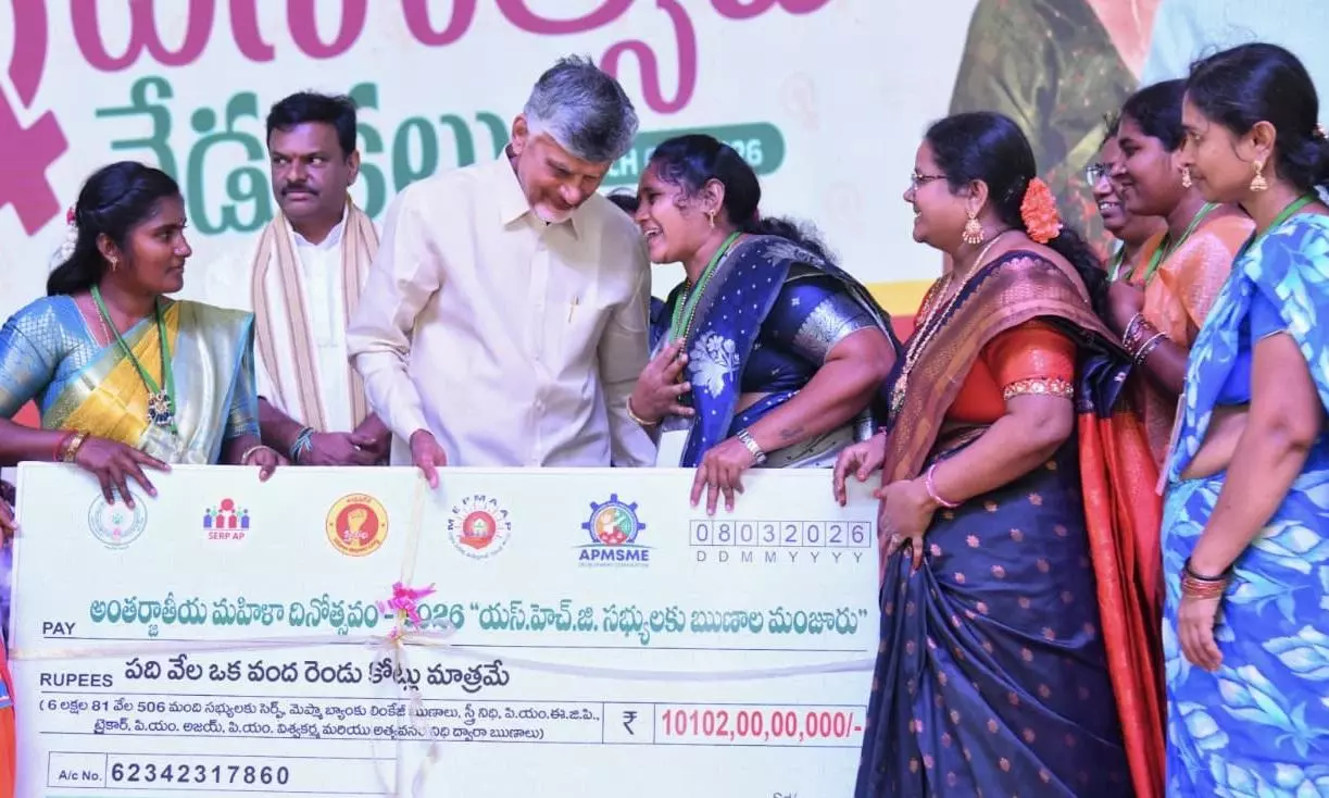 Reaffirming the government’s support for women’s financial empowerment, Naidu handed over a mega cheque of `10,102 crore in loans to women SHGs to strengthen their economic activities.