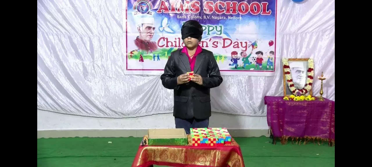 NELLORE: Children’s Day celebrations at AIMS English Medium School in BV Nagar turned noteworthy when 11-year-old Anumula Nomesh created a portrait of President Droupadi Murmu using 30 Rubik’s cubes in 5 minutes and 24 seconds — while blindfolded.