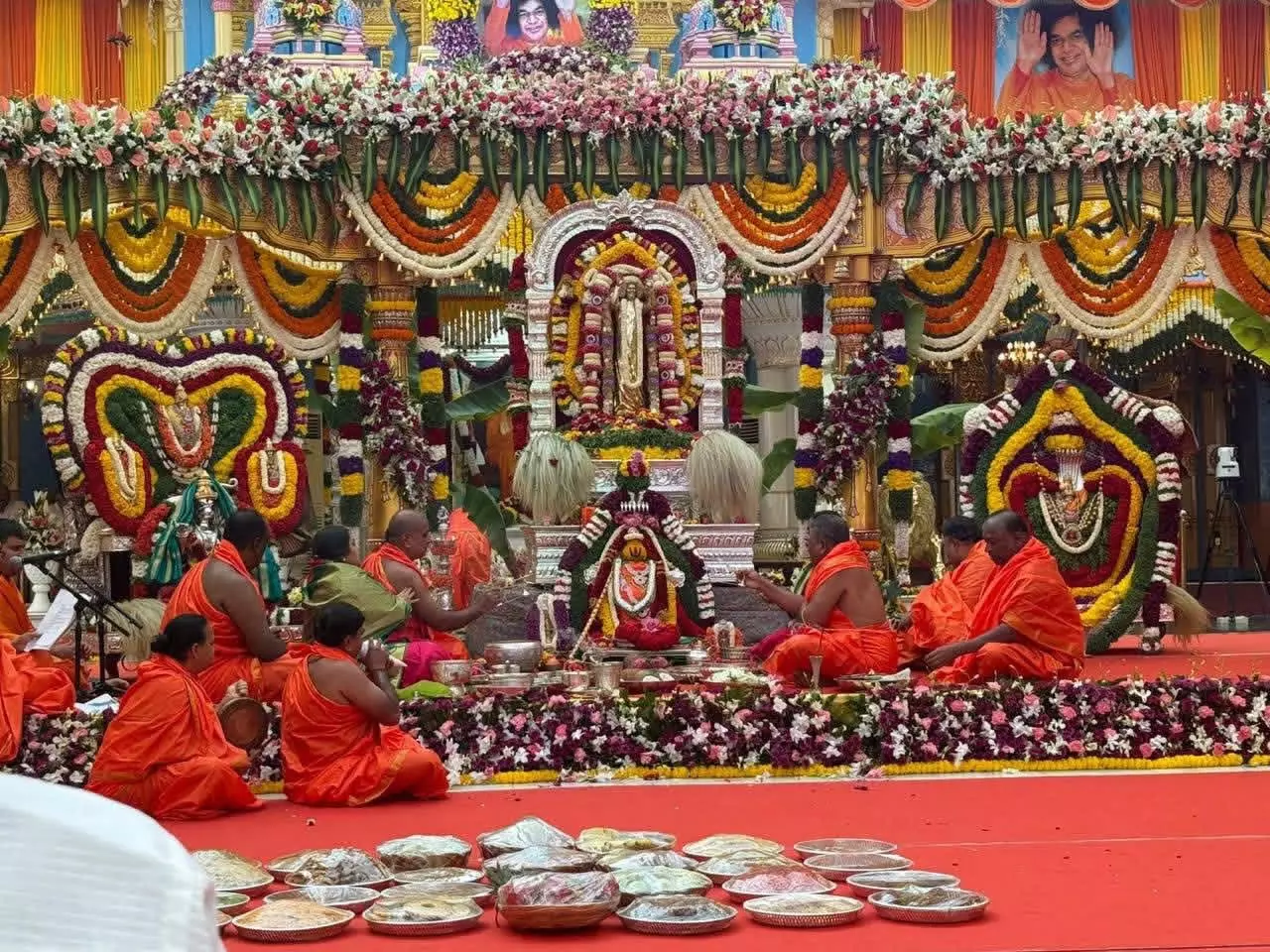 The day began with the Sri Sai Satya Narayana Vratham performed by 1,100 couples in Sai Kulwant Hall, followed by Satya Sai Central Trustee R.J. Rathnakar and Himavahini Rathnakar performing the pooja for the ratham, invoking divine blessings for commencement of the auspicious Rathotsavam.