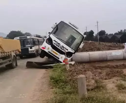 Palnadu: The spate of bus accidents continues to plague the Telugu states, with another incident reported on Monday morning in Andhra Pradesh. A private passenger bus en route from Hyderabad to Bapatla lost control and turned sideways onto a set of concrete pipes placed on the side of the road for ongoing construction work.