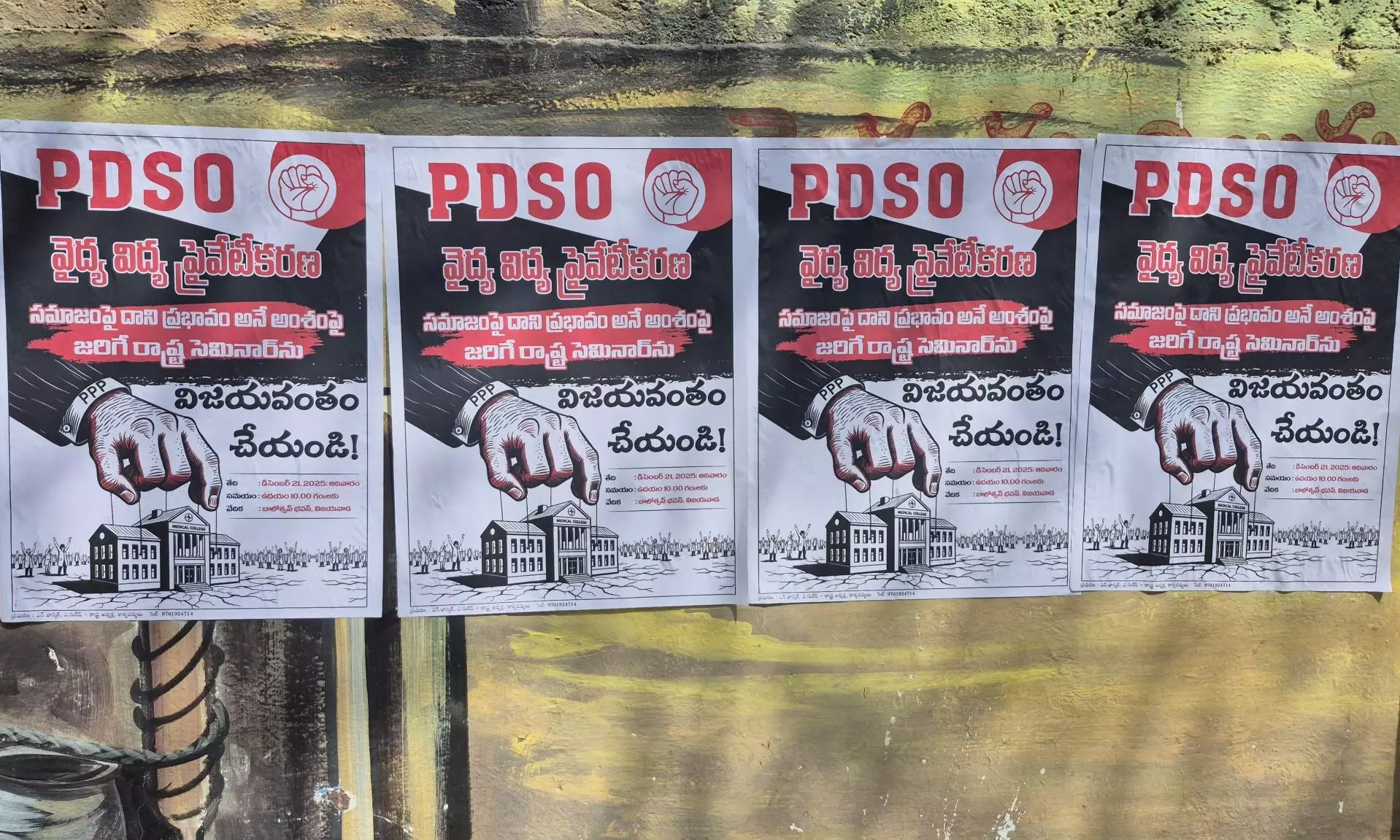 Speaking at the event, PDSO district president P. Viswanath criticised the Andhra Pradesh government’s decision to run ten of the 17 newly sanctioned medical colleges under a public-private partnership (PPP) model. He alleged that institutions in Adoni, Madanapalle, Markapuram, Pulivendula, Penukonda, Palakollu, Amalapuram, Narsipatnam, Bapatla, and Parvathipuram were being leased to private entities for 33 years, reducing SC, ST, and OBC reservations by half and converting 50% of seats into market-priced quotas.