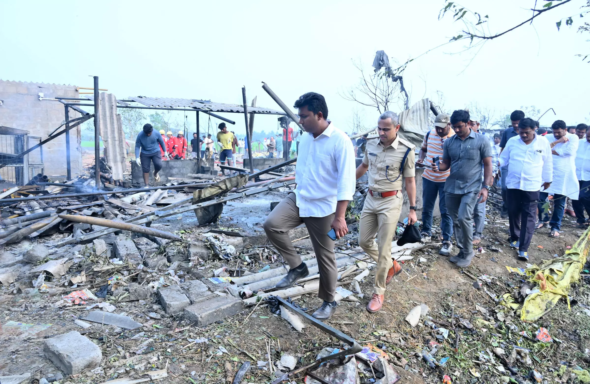 Kakinada district collector Shanmohan Sagili and SP G. Bindu Madhav inspect the accident site after an explosion at the Suryasri fireworks unit in Vetlapalem of Samarlakota mandal in Kakinada district on Saturday. — BY ARRANGEMENT