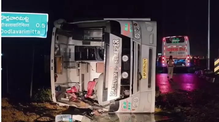 Private Travels bus topples on highway near Pellakuru mandal; 21 passengers on board.