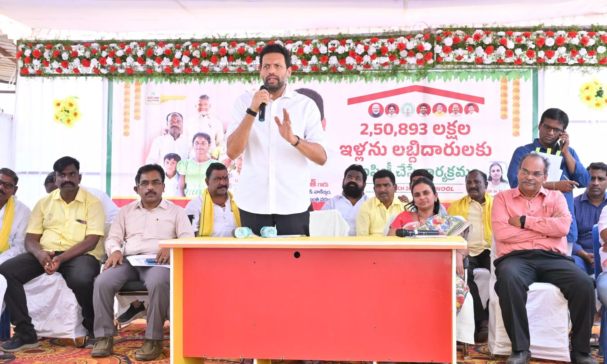 At Joharapuram, minister T. G. Bharat, along with collector A. Siri, distributed allotment papers to beneficiaries. In Nandyal, minister N.M.D. Farooq handed over houses and interacted with families.