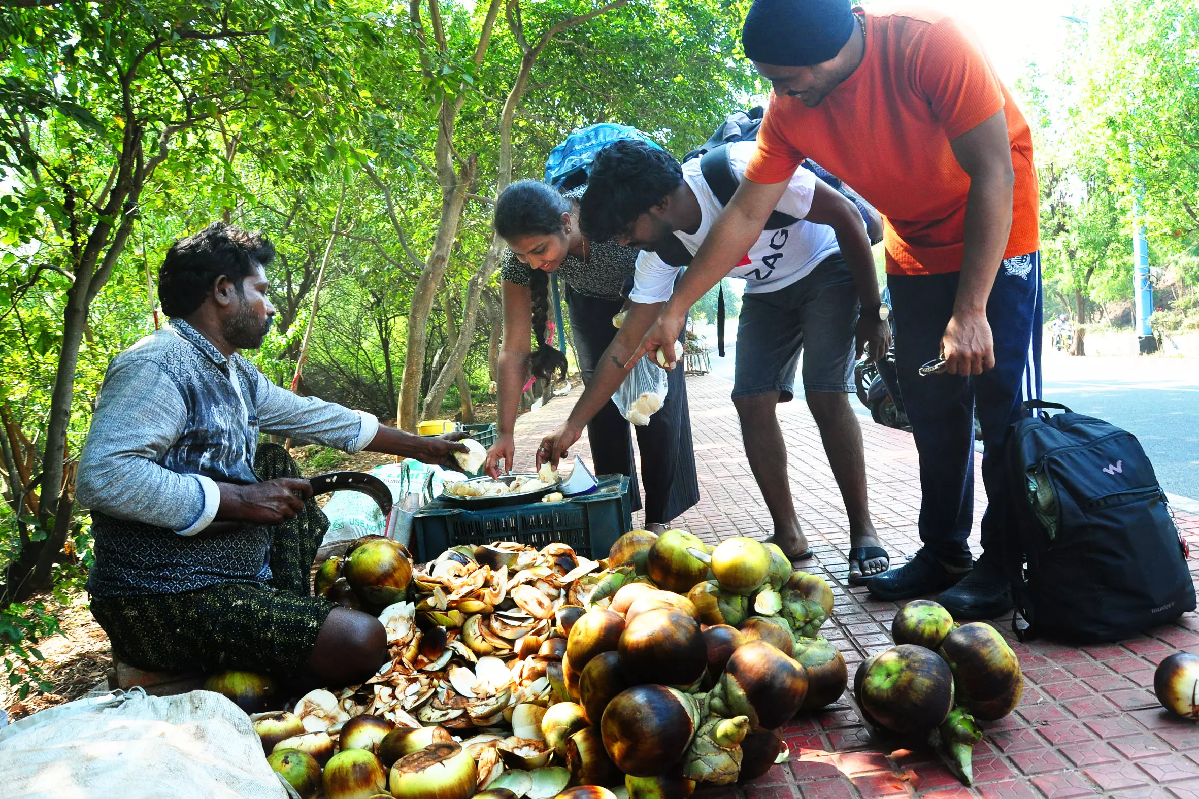 Youngsters busy in buy ice-apple from palm fruit which were kept on sale at road side on the beach road near Rushikonda in Visakhapatnam on Thursday.( Photos: P Narasimha Murthy)