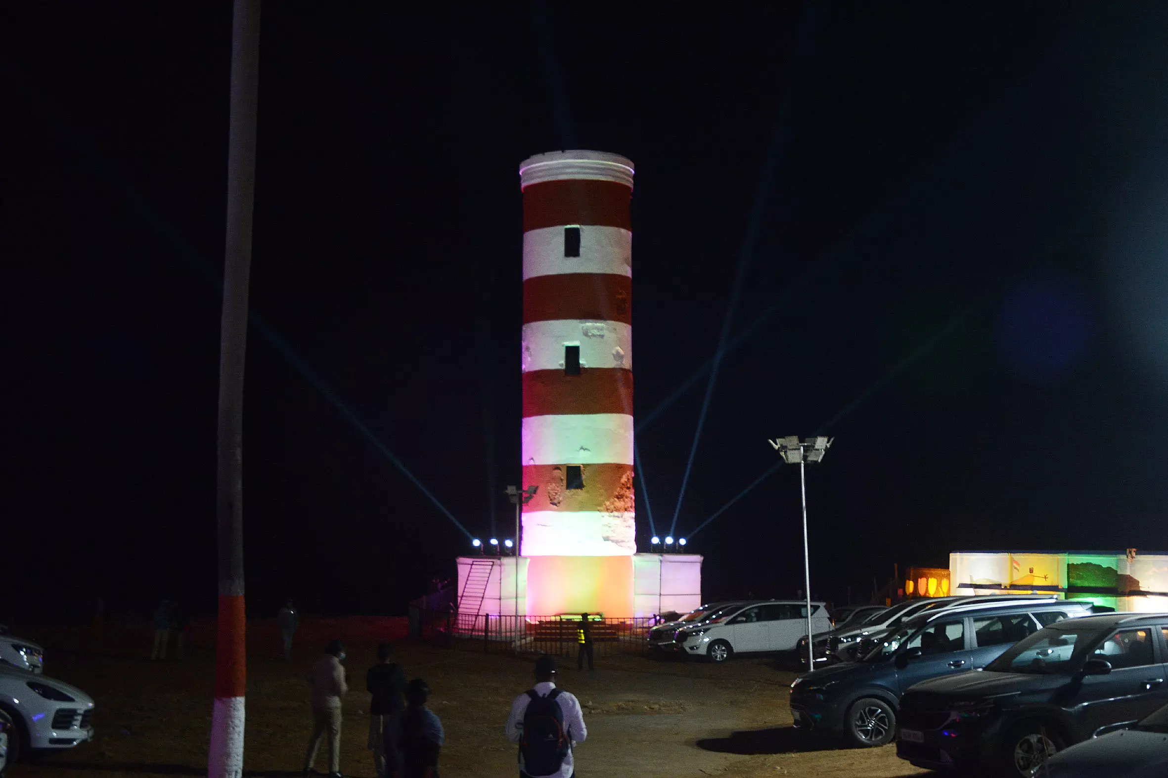 The lighthouse illuminated with laser lights during the Light House Festival 2026 near MGM Park Grounds on the beach side in Visakhapatnam (K Murali Krishna/DC)