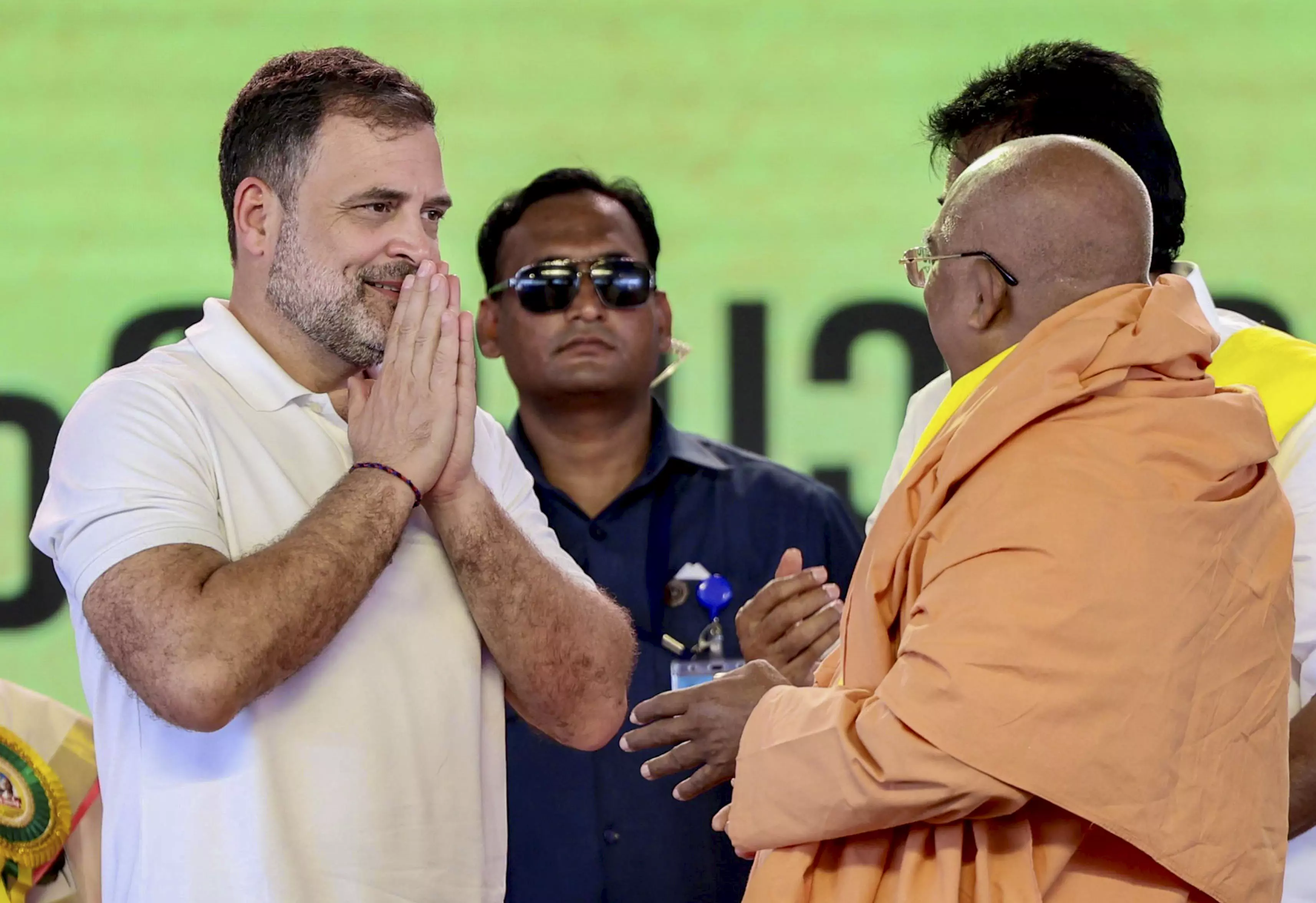 Thiruvananthapuram: Congress leader Rahul Gandhi, who is on a two-day trip to Kerala, visited the Sivagiri Math at Varkala here on Saturday. Rahul, the Leader of Opposition in the Lok Sabha, was greeted at the Math by Swami Sathchidanda, president of the ashram founded by sage and social reformer Sree Narayana Guru, and its other office bearers with a big saffron-coloured garland.