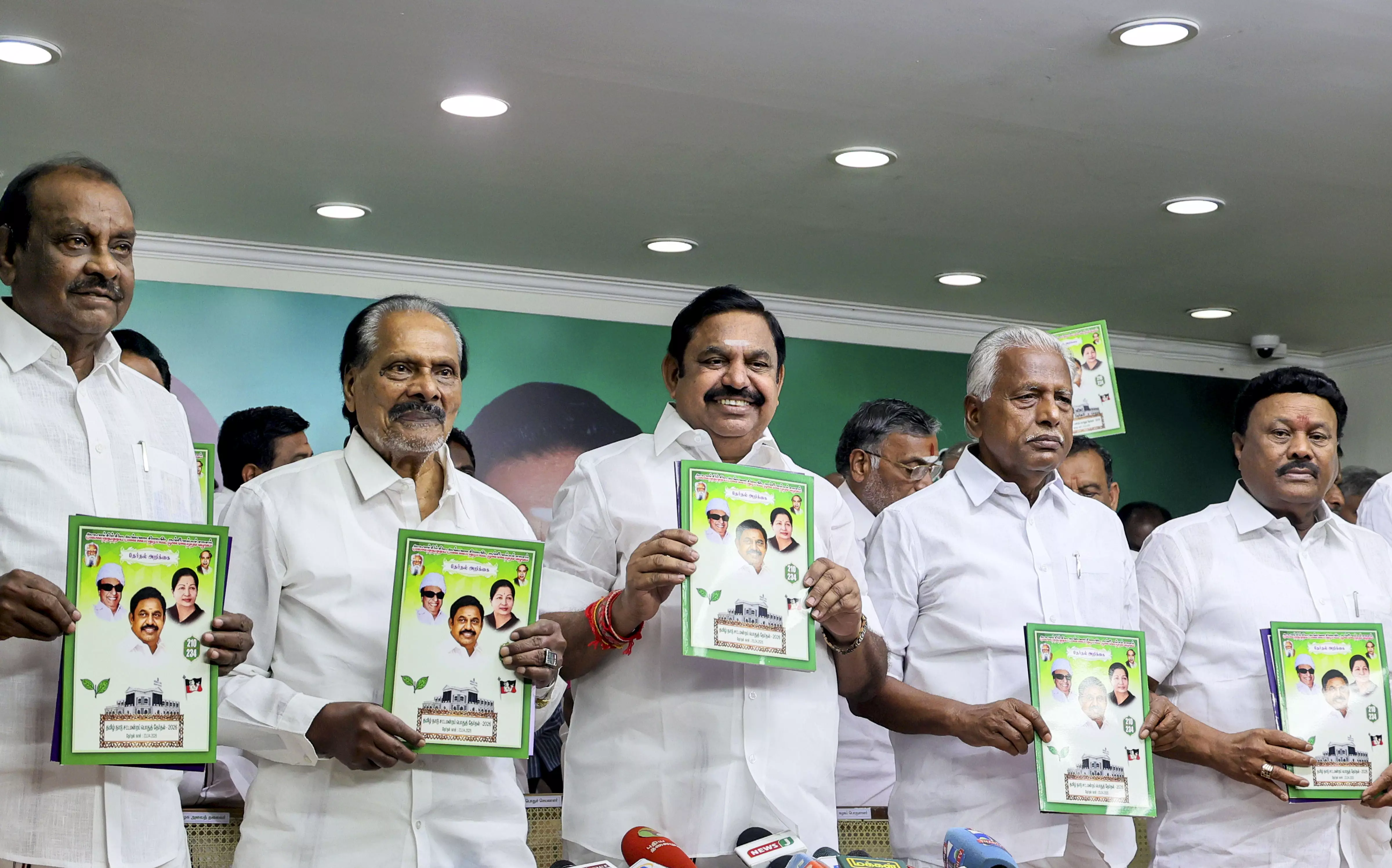 AIADMK chief and Leader of Opposition in Tamil Nadu Assembly Edappadi K Palaniswami, centre, with others releases the party's manifesto ahead of the state Assembly elections, at party headquarters, in Chennai, Tuesday, March 24, 2026. (PTI Photo)