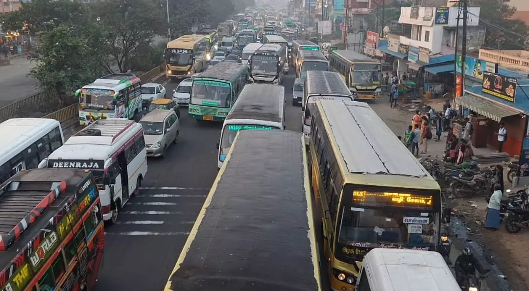 At Singaperumalkoil, the traffic queued up for three kilometres, leading to chaos at Urapakkam, Kilambakkam, Vandalur, Perungalathur, Irumbuliyur and Tambaram from Sunday evening to Monday morning. Lakhs of people got down at the Kilambakkam bus terminus and changed to the Metropolitan Transport Corporation (MTC) buses in the morning. The government and private buses stopped in the middle of the road at Kilambakkam, Perungalathur and Tambaram blocking the way for other vehicles. The Kilambakkam terminus was heavily crowded till Monday afternoon as lakhs of people got down and changed to the city buses.