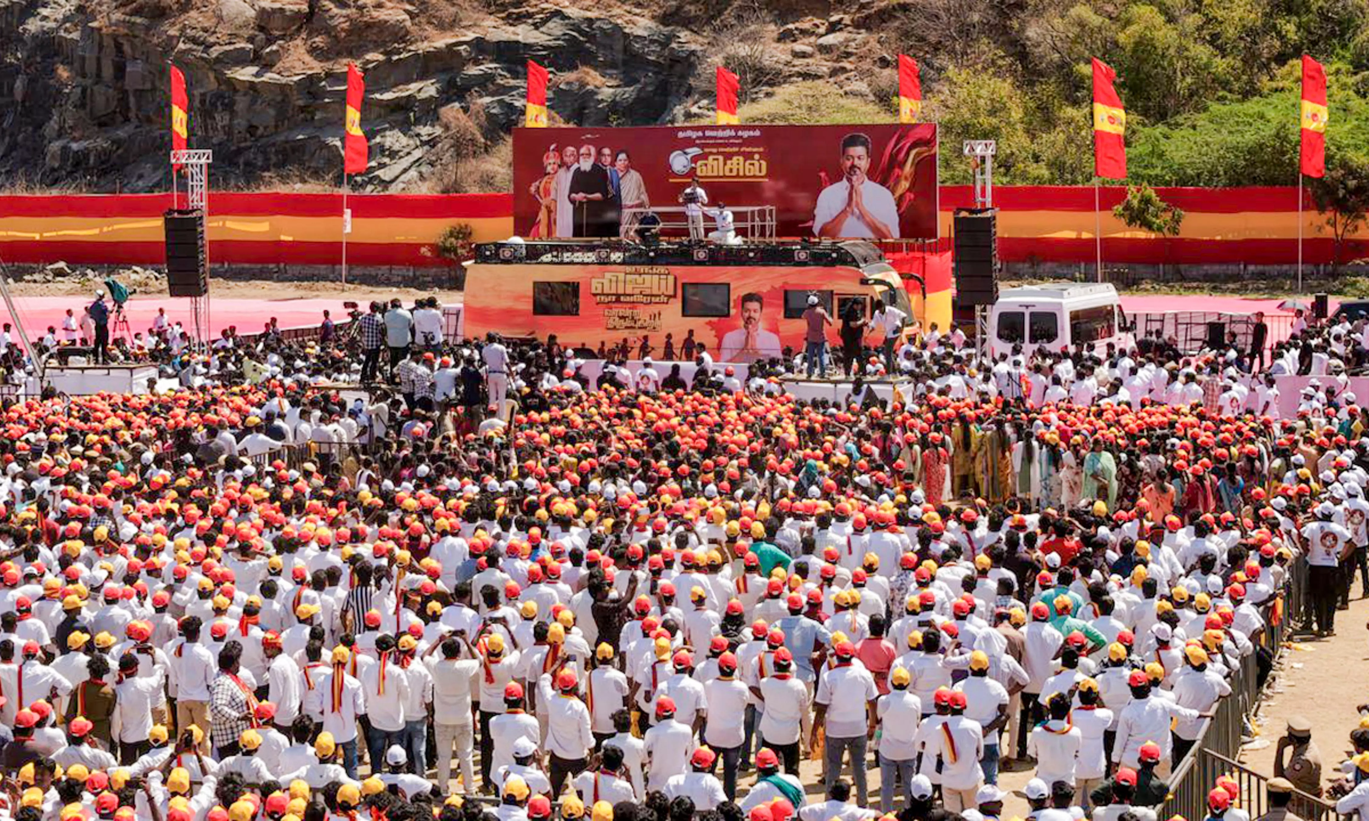 People gather during Tamilaga Vettri Kazhagam's (TVK) meeting, to be addressed by party chief Vijay, in Salem, Tamil Nadu, Friday, Feb. 13, 2026. (PTI Photo)