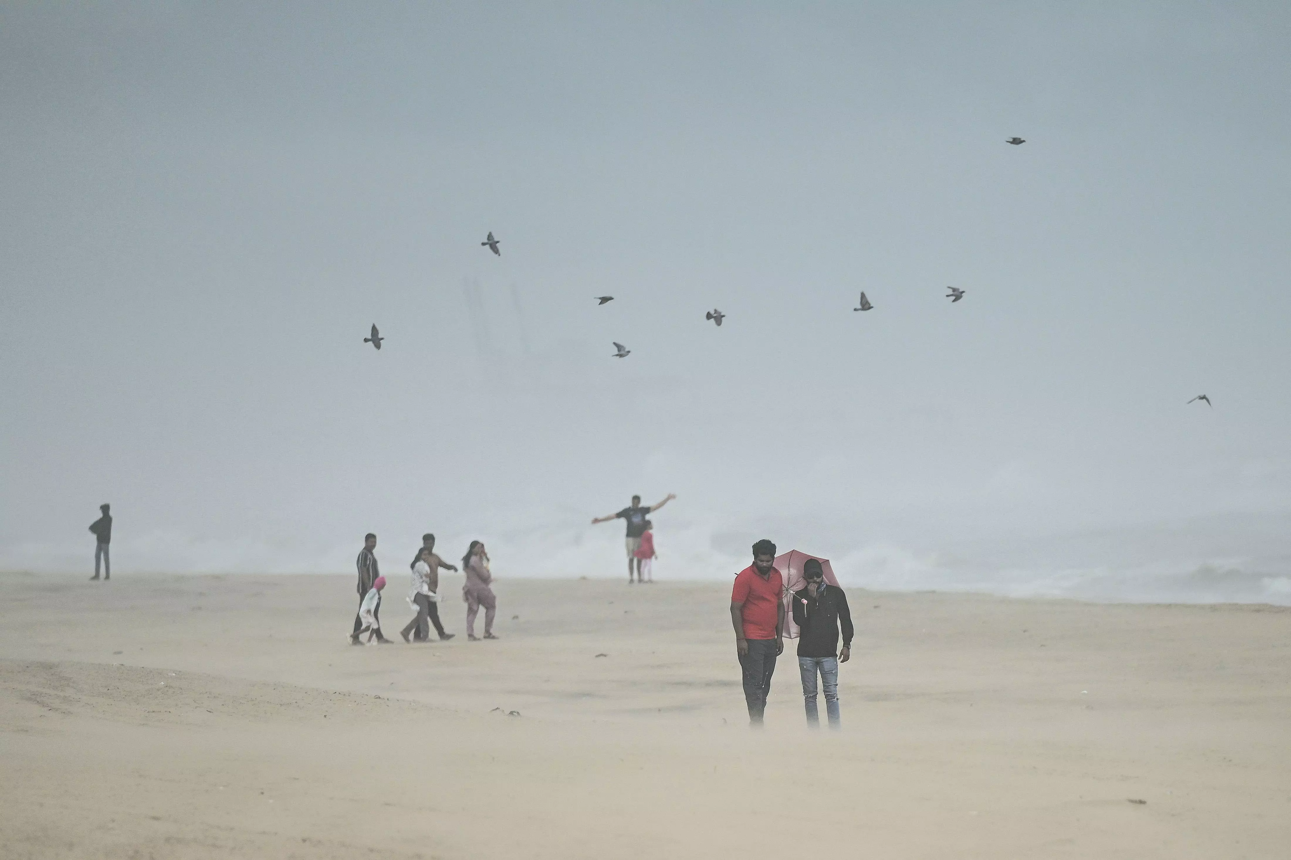 People tackle strong wind ahead of Cyclone Ditwah's landfall at the Marina beach in Chennai (R. Satish BABU / AFP)
