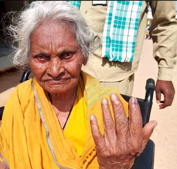 NIZAMABAD: A 105-year-old woman set an example for voters by arriving at a polling station and casting her vote on Wednesday. Korri Nagamma, 105, from Birkur mandal headquarters in Kamareddy district, came to the polling station in a wheelchair and exercised her franchise without showing any signs of fatigue.