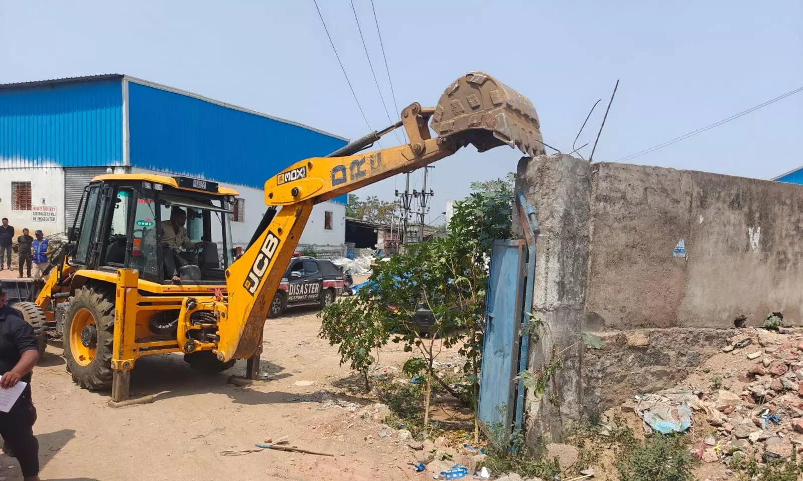At Katedan, HYDRAA removed a road encroachment which was being blocked by a wall. Authorities removed the wall and connected Madhuranagar to Indira Society Colony. Officials removed walls and commercial sheds which were barring colony residents from moving on the roads amid local police presence.