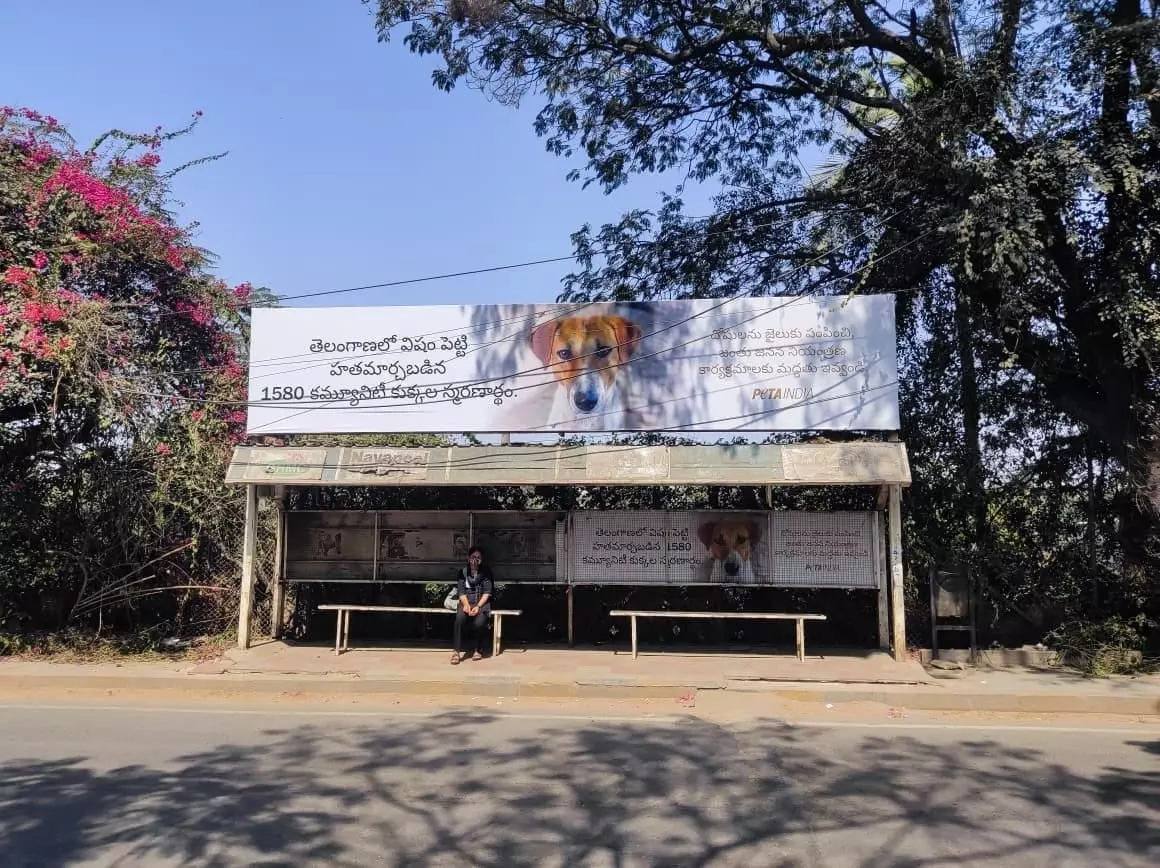 The display, erected by PETA along High Court Road in Ghansi Bazaar, features the image of a dog and cites killings reported from Jagtial, Hanamkonda, Kamareddy, Rangareddy and Nirmal districts. According to the organisation, the animals were often poisoned in broad daylight.