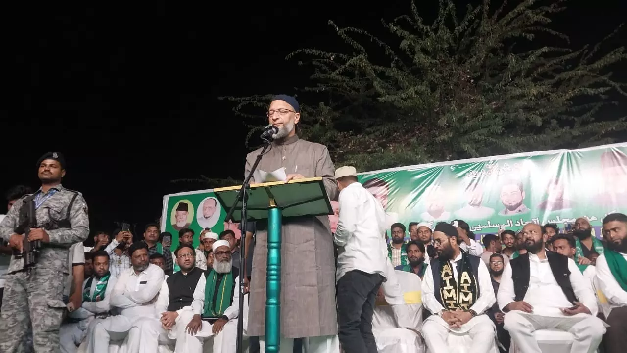 AIMIM president and Hyderabad MP Asaduddin Owaisi addressing a Jalsa-e-Aam public meeting at the Circus Ground in Mukarampura, Karimnagar, on Saturday.