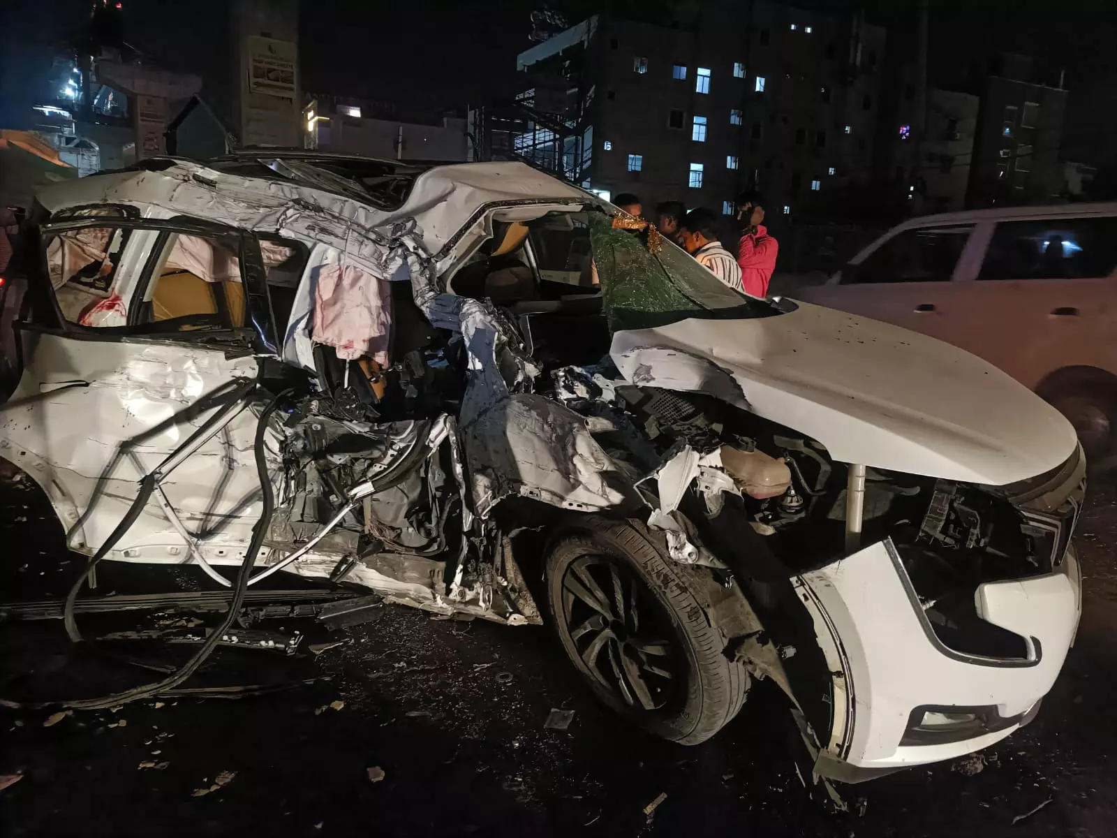 The mangled remains of a car damaged after ramming to a pillar at Medipally. (Photo: By Arrangement)