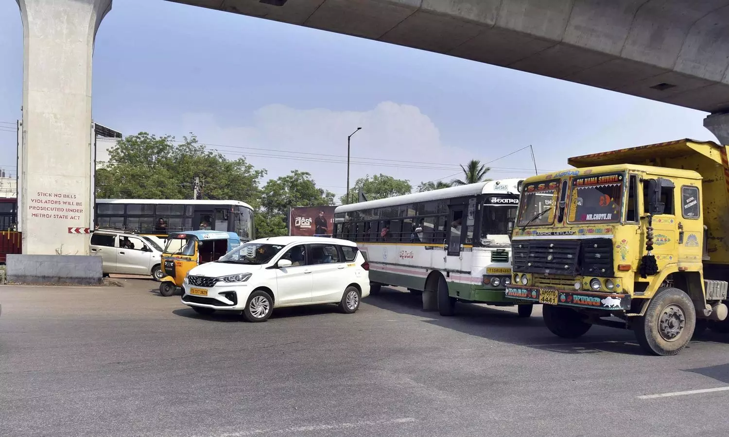 Congestion intensifies during peak hours with the movement of school and college buses, RTC buses, cabs and office commuters, reducing traffic to a crawl.