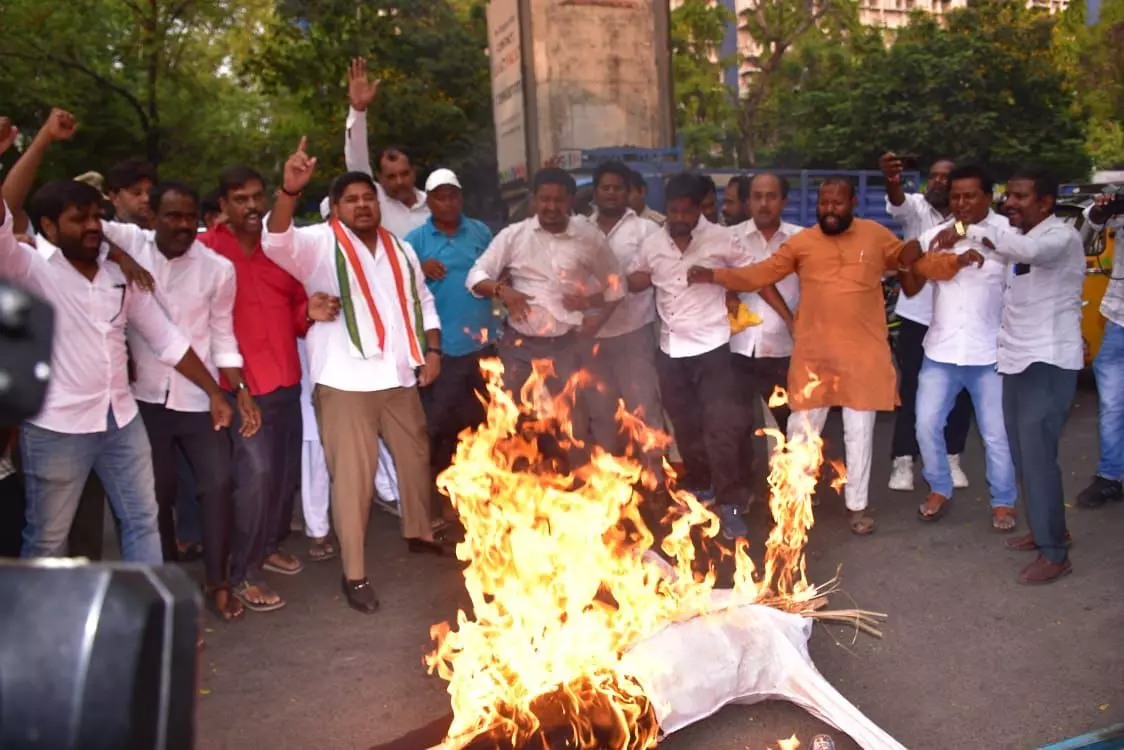 Congress workers burn an effigy of BJP MP Tejasvi Surya at Gandhi Bhavan on Thursday