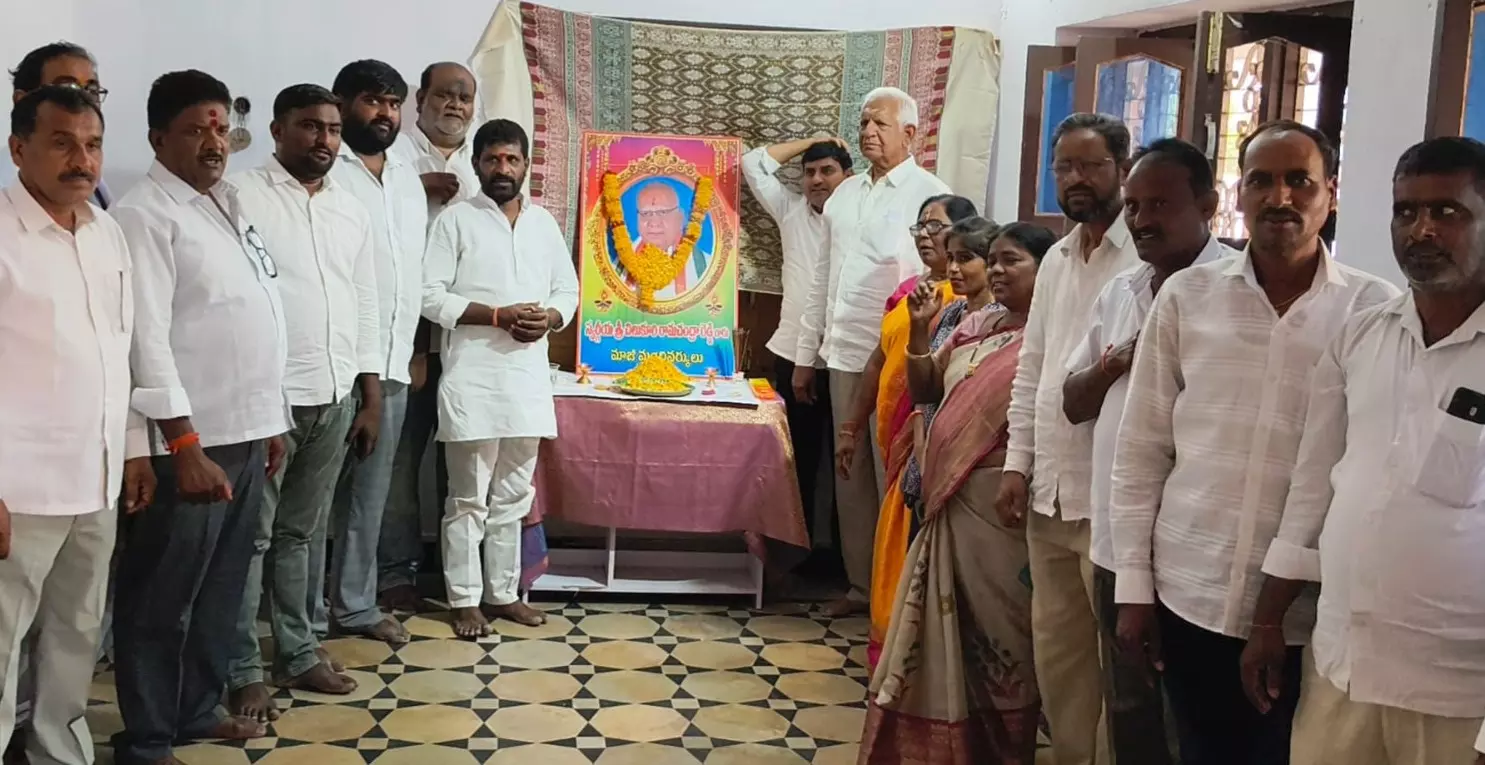 Congress leaders and cadre observe former minister C. Ramchandra Reddy’s 82nd birth anniversary at a DCC office in Adilabad on Friday; the office is functioning from rented premises. (Image: DC)