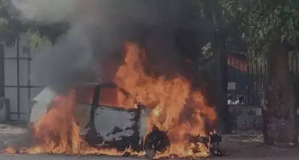 However, no one was injured. On seeing flames, passers-by informed the matter to the fire control room. A fire tender rushed to the spot and the flames were doused within minutes. The car was completely damaged in the incident.