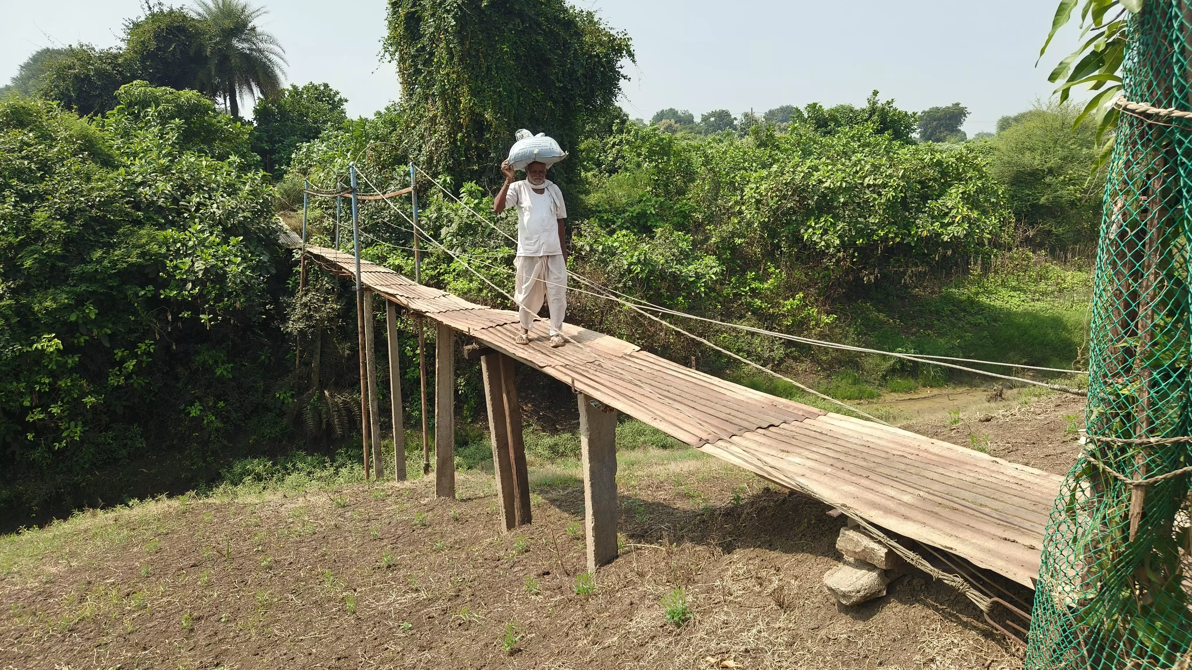 His farm is located along the Penganga River. He used iron sheets as the bridge’s pathway, with iron pipes and cement pillars serving as structural supports. Damaged silver wire was secured on both sides of the bridge, providing stability for those crossing.