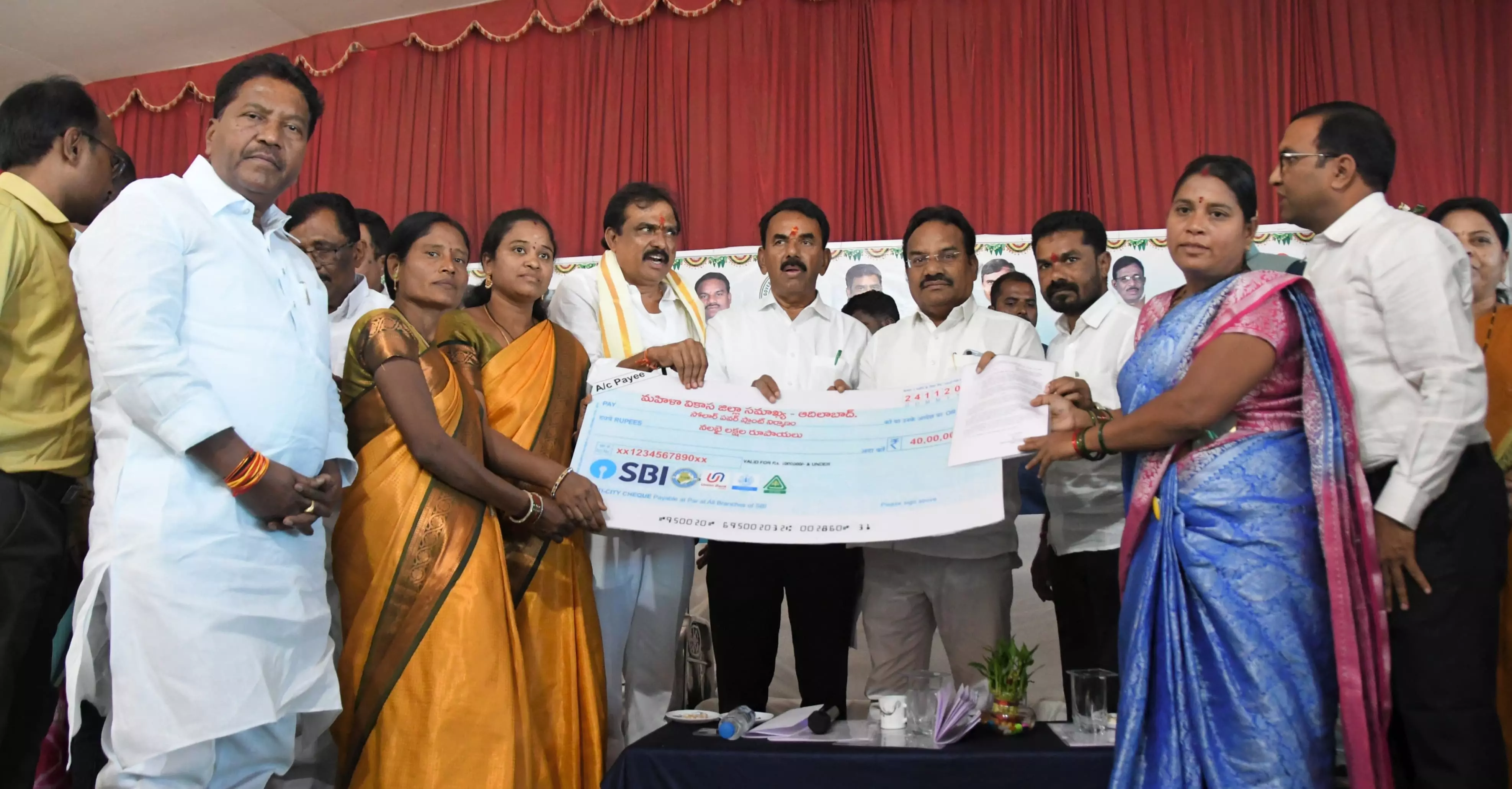 Caption: Minister Jupally Krishna Rao distributes Indira Mahila Shakti saris and SHG loan papers in Adilabad on Monday. MP Godam Nagesh and MLA Payal Shankar are also seen.