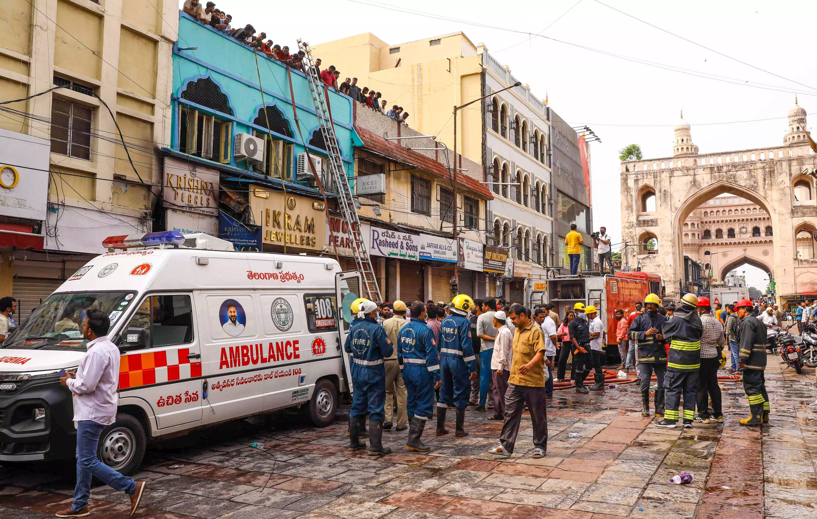 Firefighters at work after a fire broke out in a building near Gulzar Houz in the Old City area of Hyderabad in Telangana, Sunday, May 18, 2025. At least eight people lost their lives and several others injured in the tragic incident. (PTI Photo)