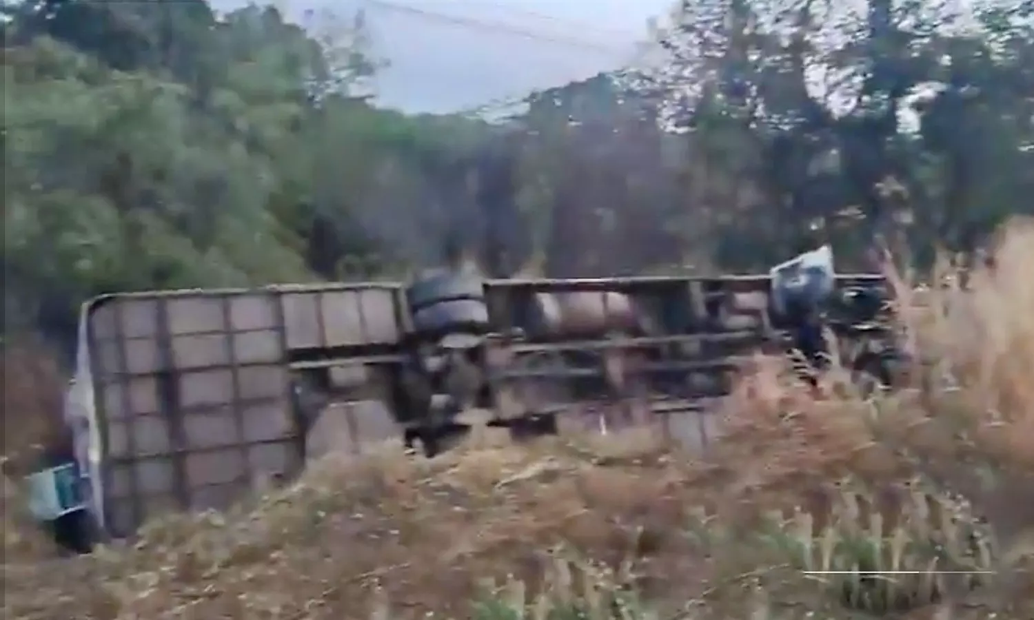 A private travels bus en route from Karnataka to Hyderabad overturned on National Highway 65 near Chintalghat in Kohir Mandal, Sangareddy district, on Tuesday. The driver reportedly lost control while maneuvering to avoid an oncoming bus, causing the vehicle to veer off the road.