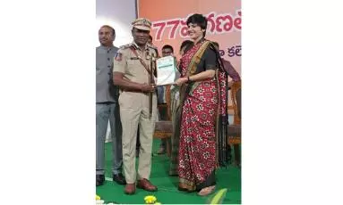 Hyderabad district collector Harichandana Dasari presents district fire officer Thagaram Venkanna with a commendation certificate, on Monday. (DC)