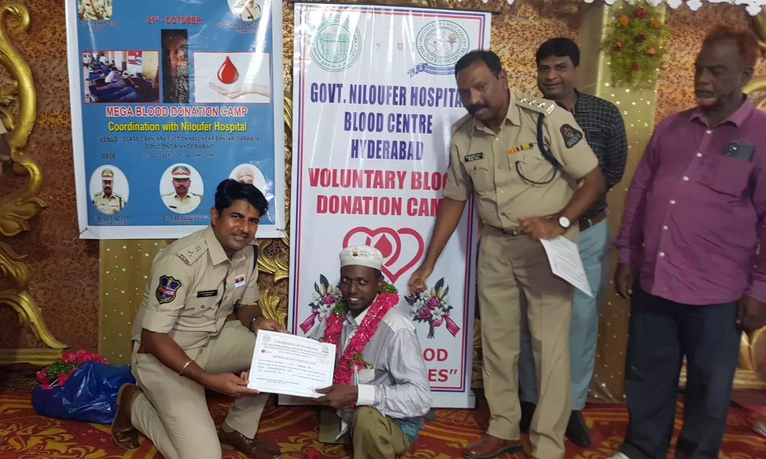 Hyderabad: Mohammed Zahed Ali, a physically disabled person, voluntarily donated blood at an event held as part of the Police Commemoration Week, under the Golconda police limits, here on Monday. DCP G. Chandra Mohan felicitated Zahed Ali and lauded his gesture.
