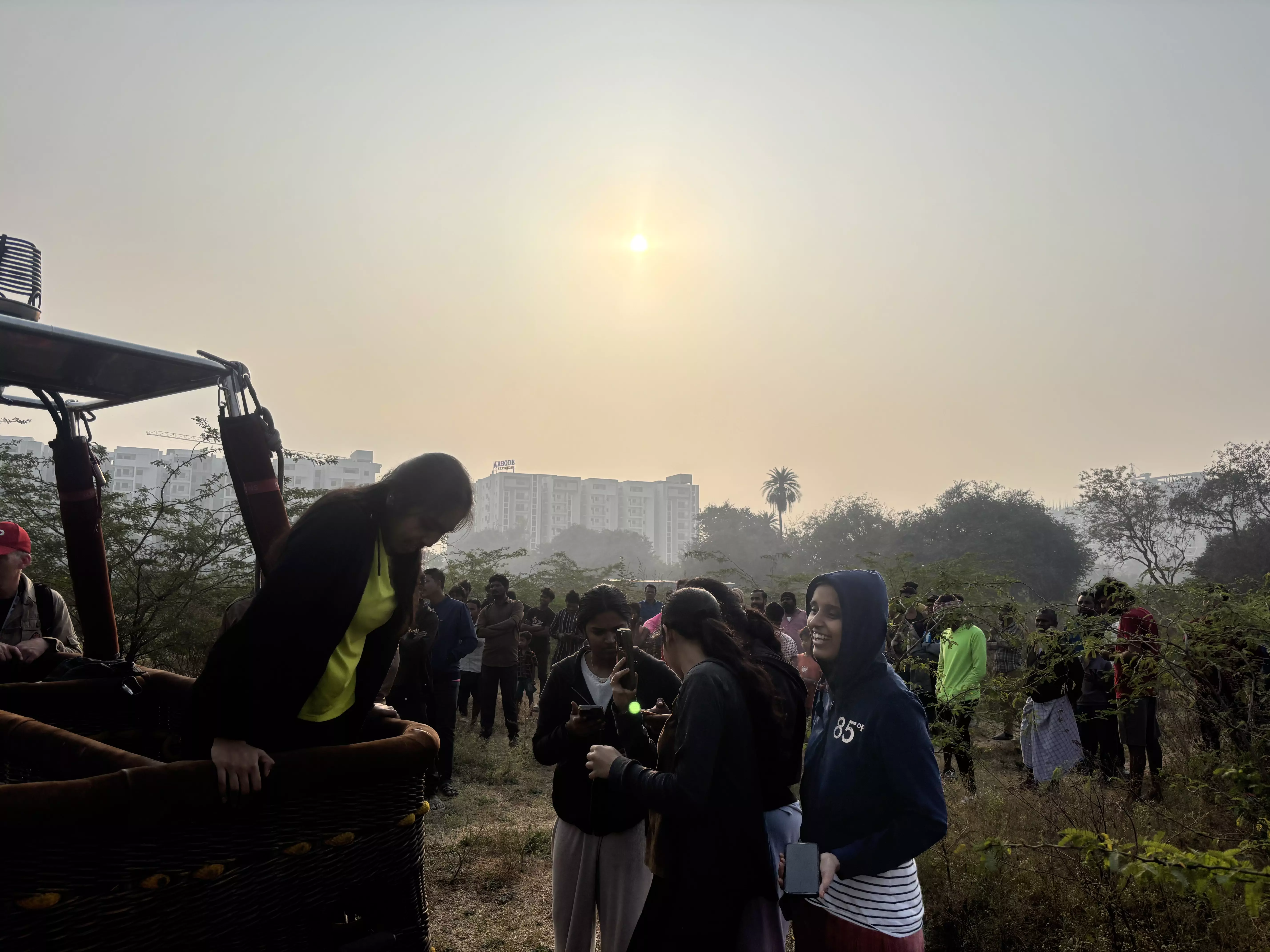 The sight of balloons drifting overhead drew delighted reactions. Morning walkers waved, labourers paused to record videos, and NCC girls posed inside a basket.