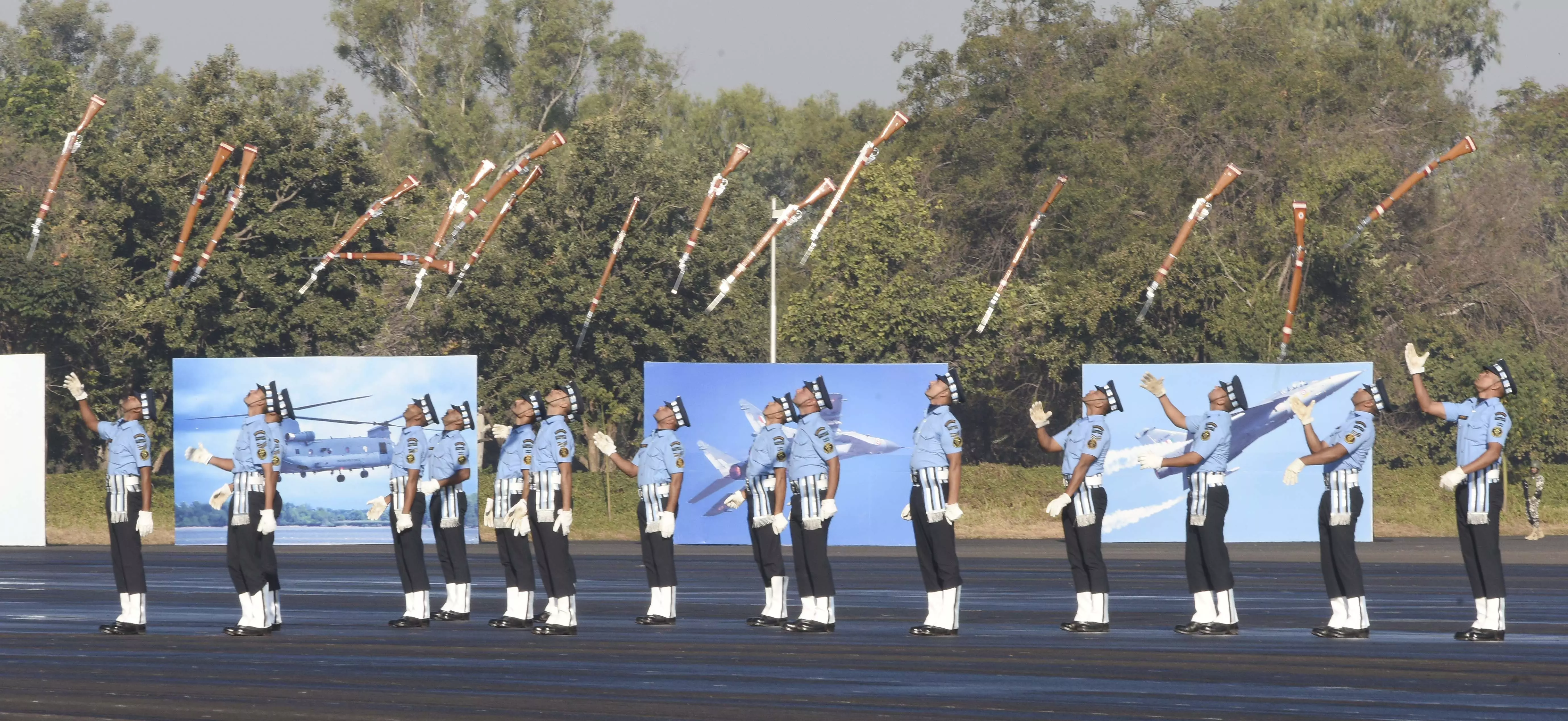 The ceremony featured spectacular displays by the Akash Ganga skydiving team and the Air Warrior Drill Team, along with fly-pasts by Pilatus PC-7, Hawk, Kiran and Chetak aircraft. Aerial displays by the Sarang helicopter display team and the Suryakiran Aerobatic Team were among the major highlights of the event.