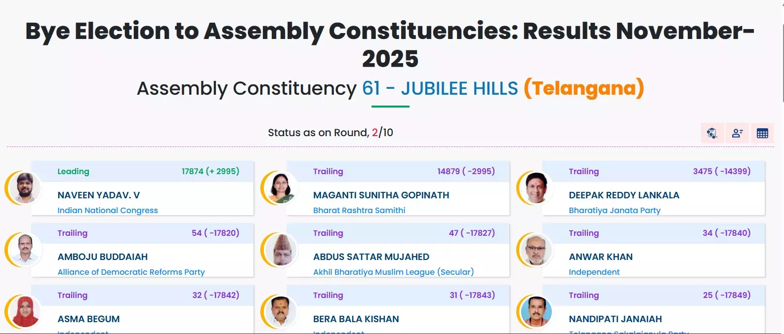 Congress continues to maintain a strong lead over its nearest rival in the Jubilee Hills bye-election. After the completion of the eighth round of counting, Congress candidate Naveen Yadav has extended his lead to 21,495 votes.
