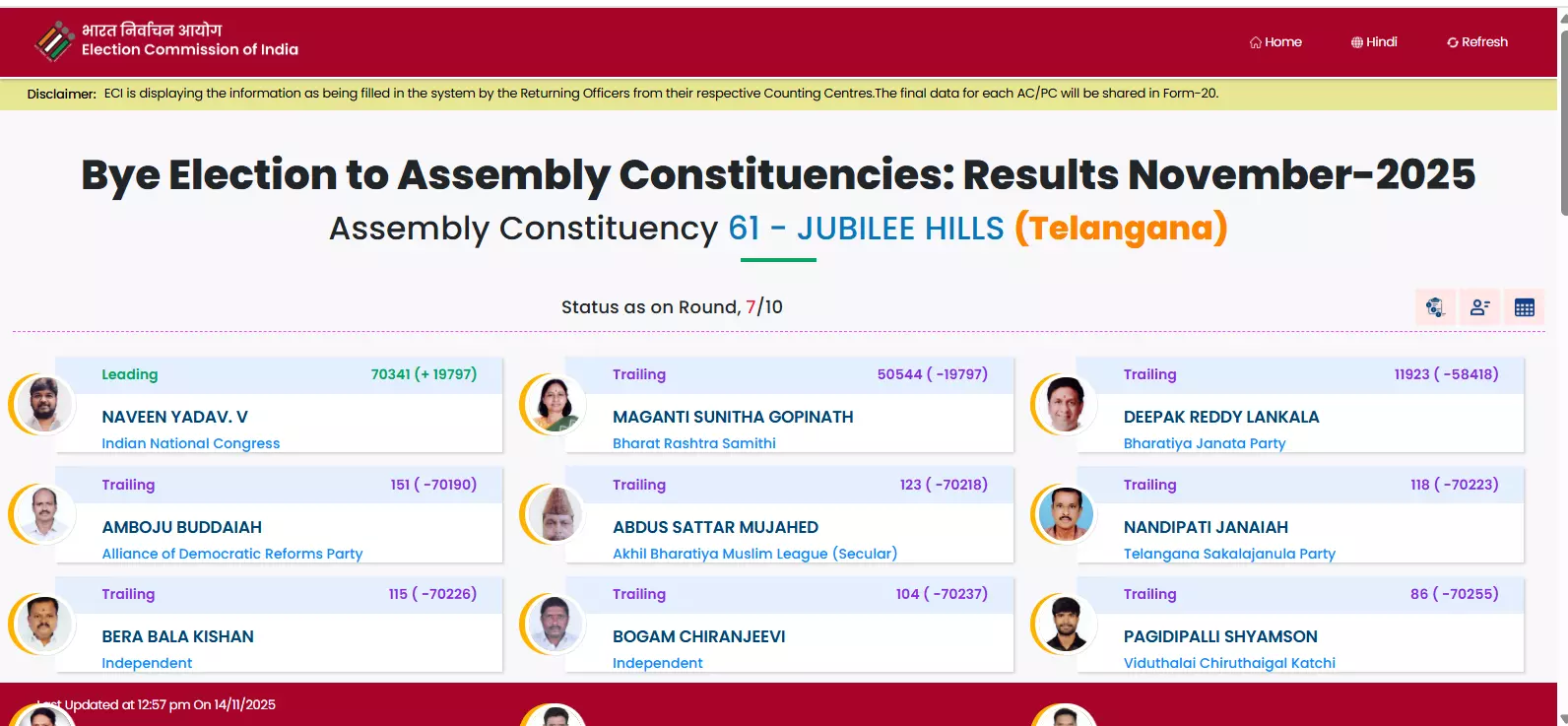 The Congress party is extending its strong lead in the Jubilee Hills Assembly bye-election as counting progresses. According to the latest figures available after Round 7 of 10, Congress candidate Naveen Yadav V is firmly ahead with 70,341 votes, holding a commanding lead of 19,797 votes.
