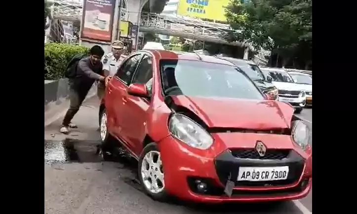 The injured person was shifted to a nearby private hospital. As no complaint was lodged with the Madhapur police, no case was registered. A video showing a man and a Madhapur traffic constable pushing the car aside to ease traffic movement was widely shared on X.