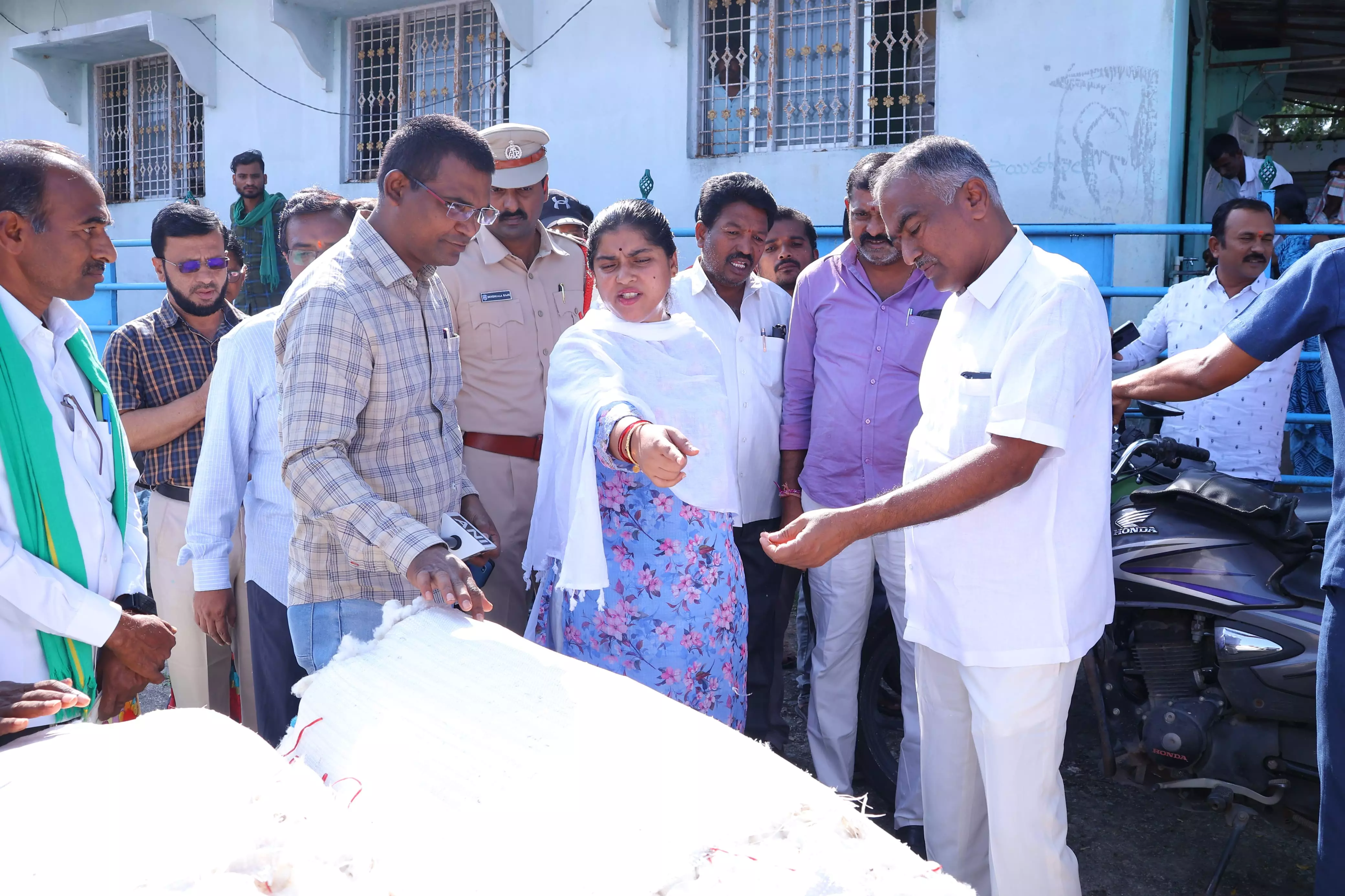 District collector Satya Sharada also visited the Enumamula market yard on Thursday to review cotton sales and transactions. She inspected the procurement process and market records, and interacted with farmers about prices and facilities.