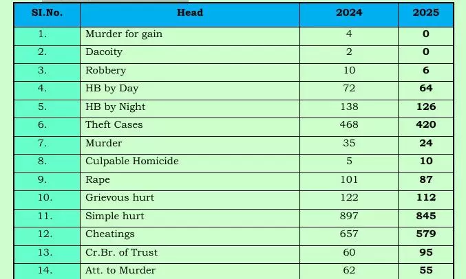 Crimes against women in Nalgonda district recorded a marginal increase in 2025, with 703 cases compared to 684 in 2024. Dowry murder cases remained nil in both years, while dowry deaths rose from one to two. Abetment to suicide cases remained unchanged at 10.