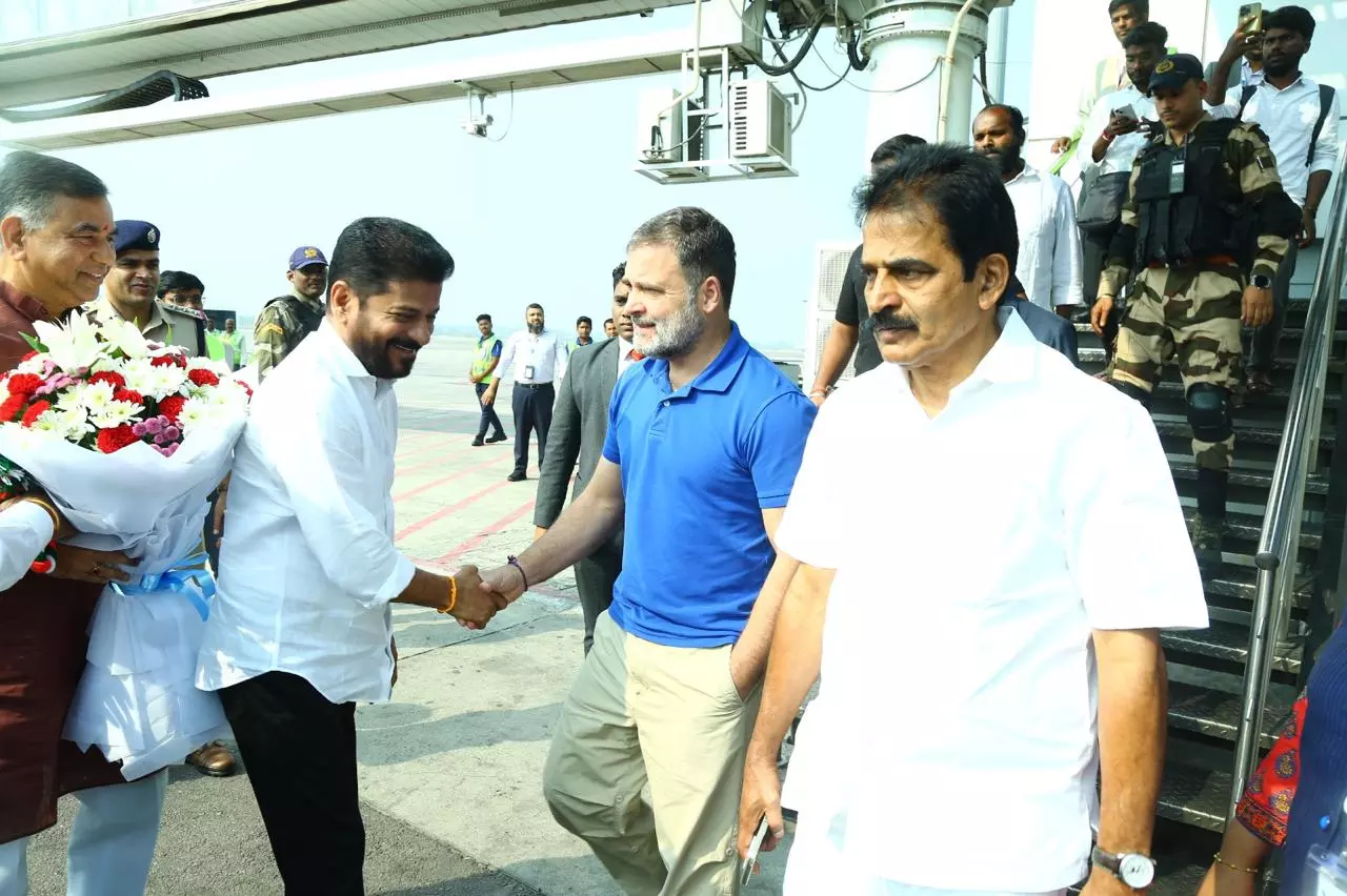 Telangana Chief Minister A Revanth Reddy welcoming Leader of Opposition in Lok Sabha, Rahul Gandhi, in Hyderabad on Monday.
