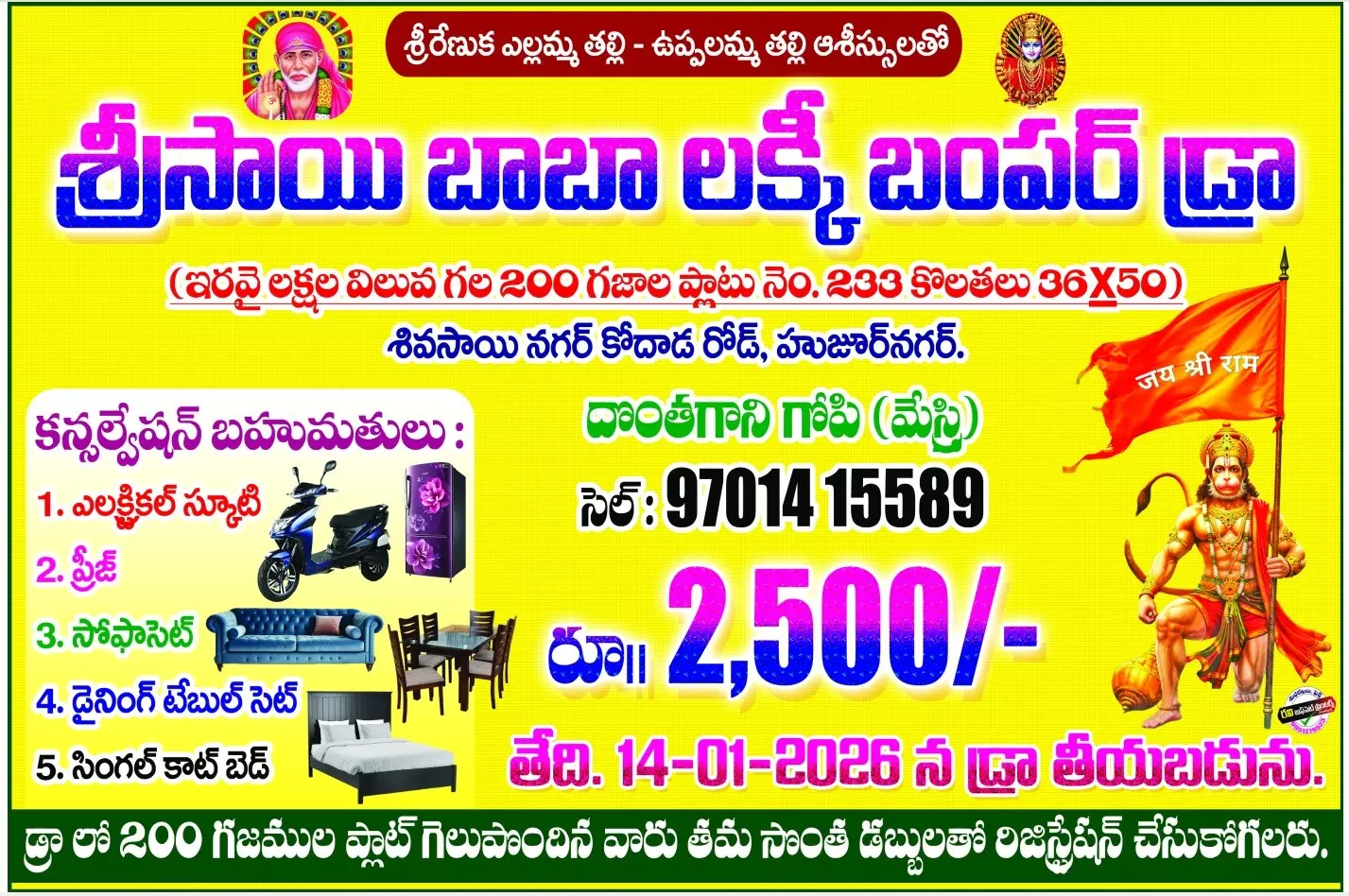Similarly, realtor Donthagani Gopi announced a lucky draw for his 200-square-yard open plot at Shiva Sai Nagar in Huzurnagar, Suryapet district. He fixed the coupon price at ₹2,500 and offered five consolation prizes, an electric scooter, refrigerator, sofa set, dining table set, and single cot bed.