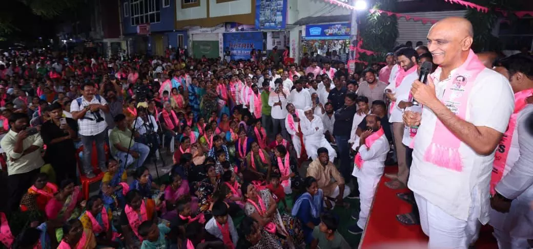 Photo caption: BRS senior leader T. Harish Rao addresses a party campaign meeting in Ambedkarnagar of Shaikpet division on Saturday.