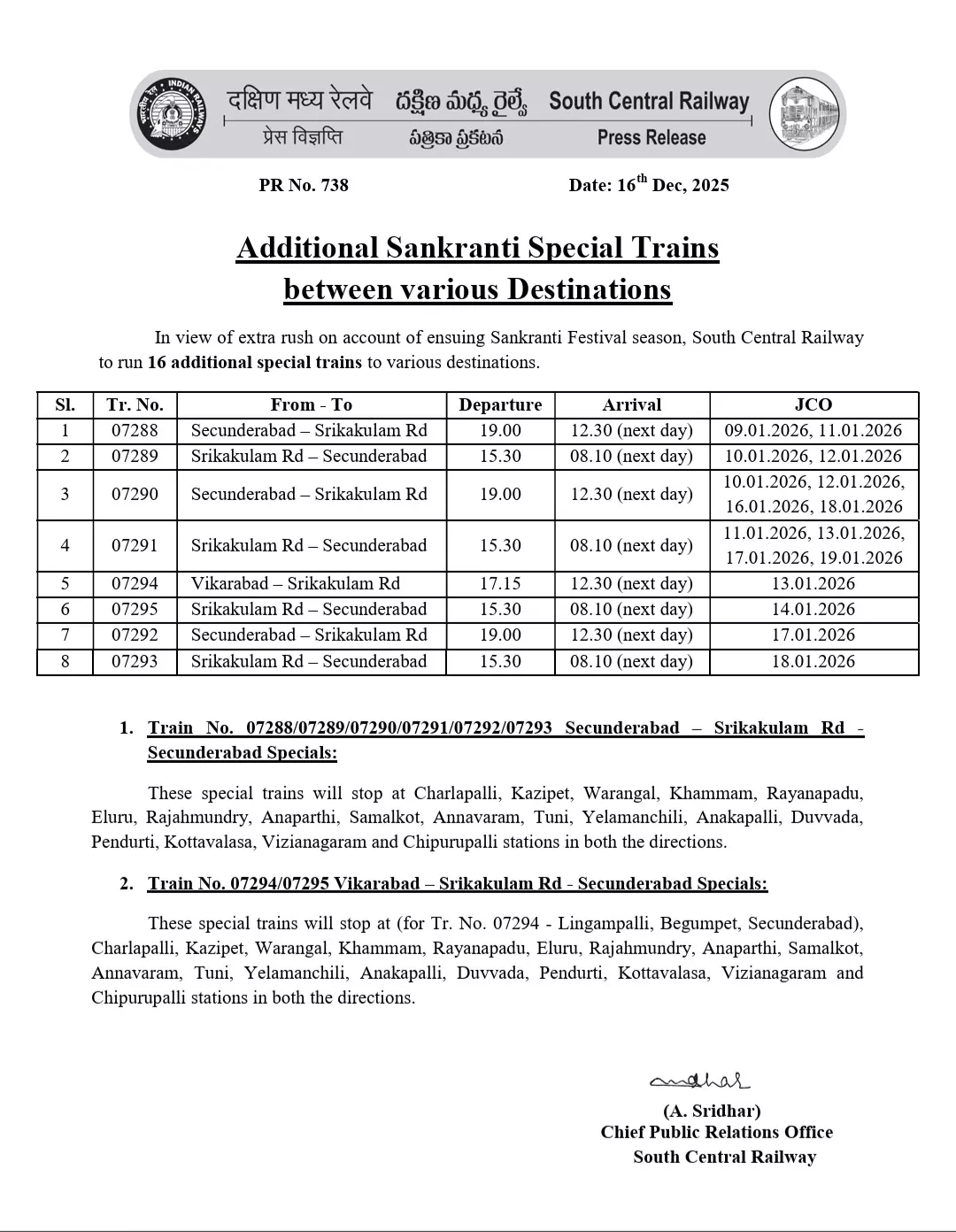 Hyderabad: South Central Railway (SCR) has announced the operation of 16 additional Sankranti special trains to clear the expected surge in passenger traffic during the festival season. The specials will connect Secunderabad, Vikarabad, and Srikakulam Road on select dates in January 2026, offering relief to travellers heading towards Telangana and north coastal Andhra Pradesh.