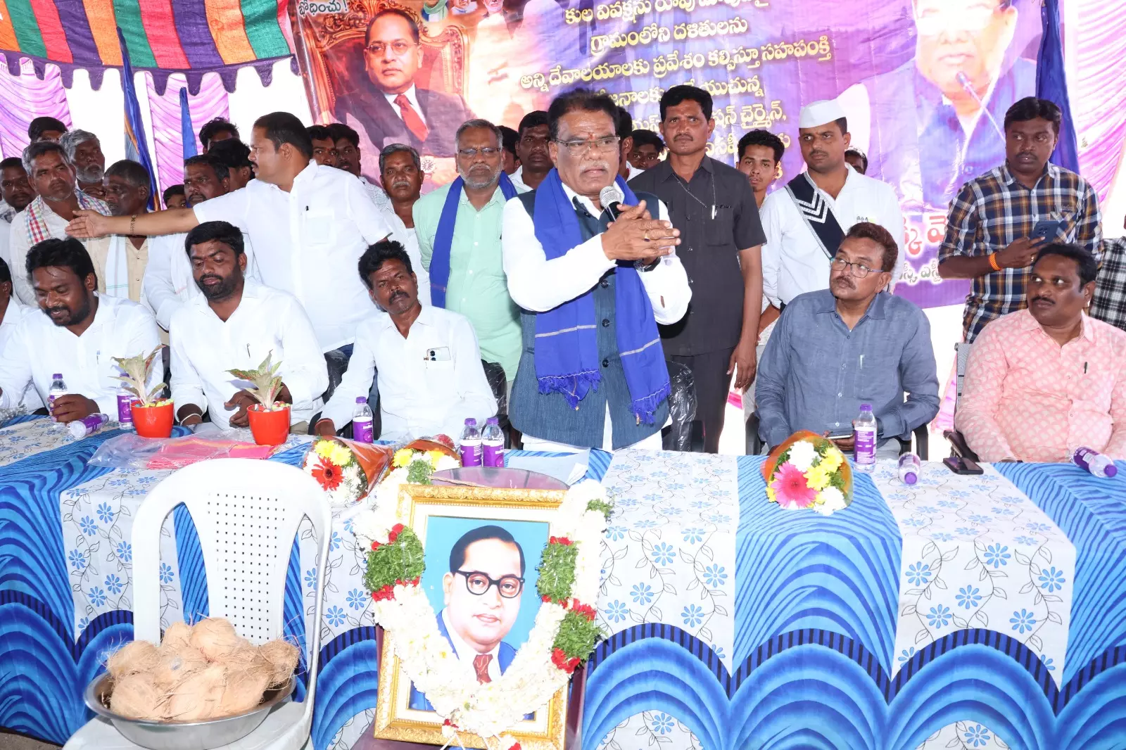 At the start of the programme, Venkataiah paid tributes to B.R. Ambedkar by garlanding his portrait. Community meals were later organised, with participation from villagers across sections.