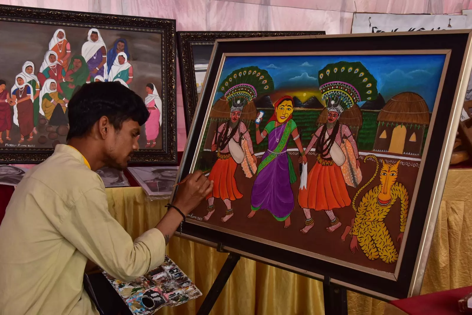 Ramu said working with acrylic colours on canvas requires patience and commitment to retain the essence and relevance of each subject. He recalled that his interest in art began while studying in Class 8 at a tribal Ashram school, when he drew a pencil sketch of his teacher Dattu. Encouragement from friends further motivated him to pursue painting.