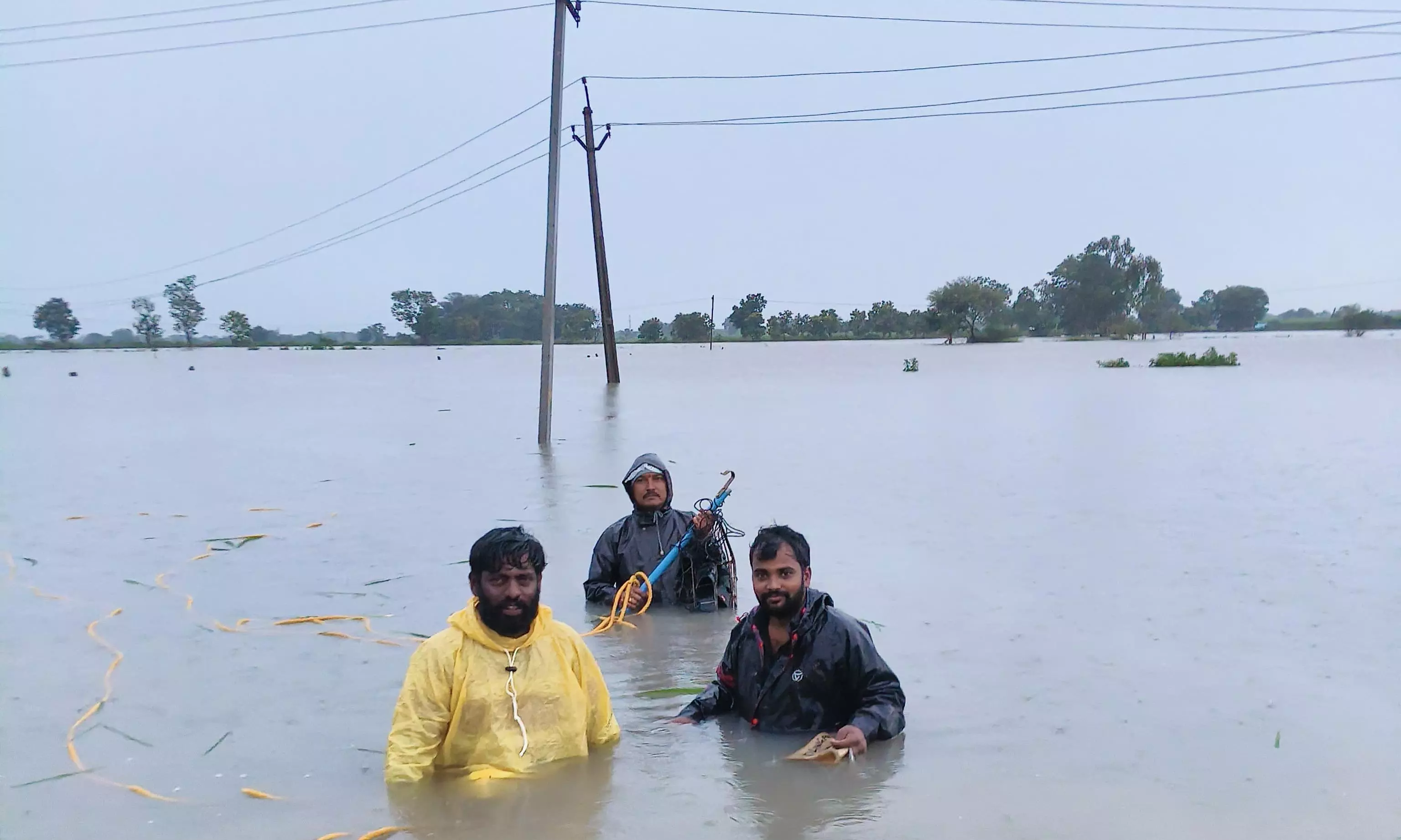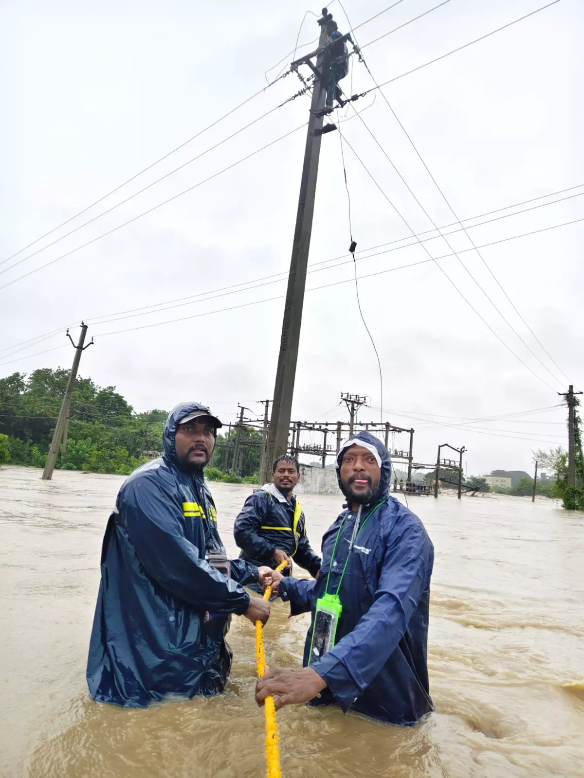 NPDCL CMD K. Varun Reddy, along with senior officials, visited the affected zones in Nizamabad, Karimnagar, and Jagtial to oversee restoration efforts. Power workers braved floodwaters, swimming across a lake with ropes in Gundaram to repair lines and restore electricity.