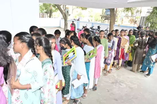 Students enter the examination centre in a queue in Karimnagar. (Photo: X)