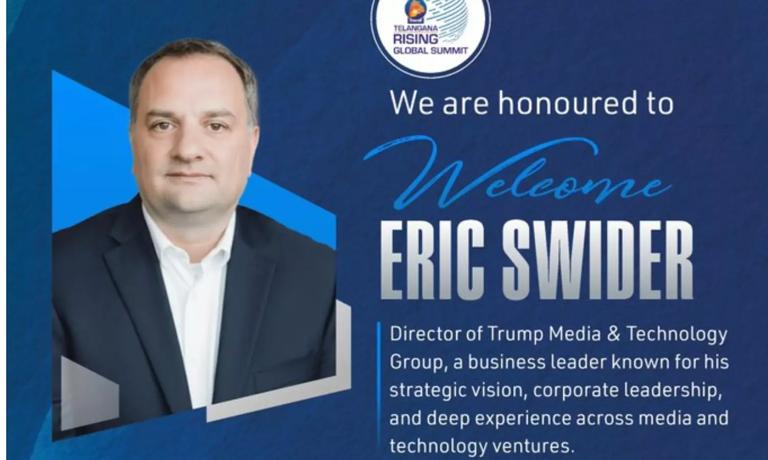 Trump Media Director Eric Swider pledged up to ₹1 lakh crore investment over the next decade in Telangana's Future City and other developments at the Telangana Rising Global Summit. He addressed CM A. Revanth Reddy with gratitude during the inaugural plenary. The massive commitment boosts the state's $3 trillion economy target by 2047.